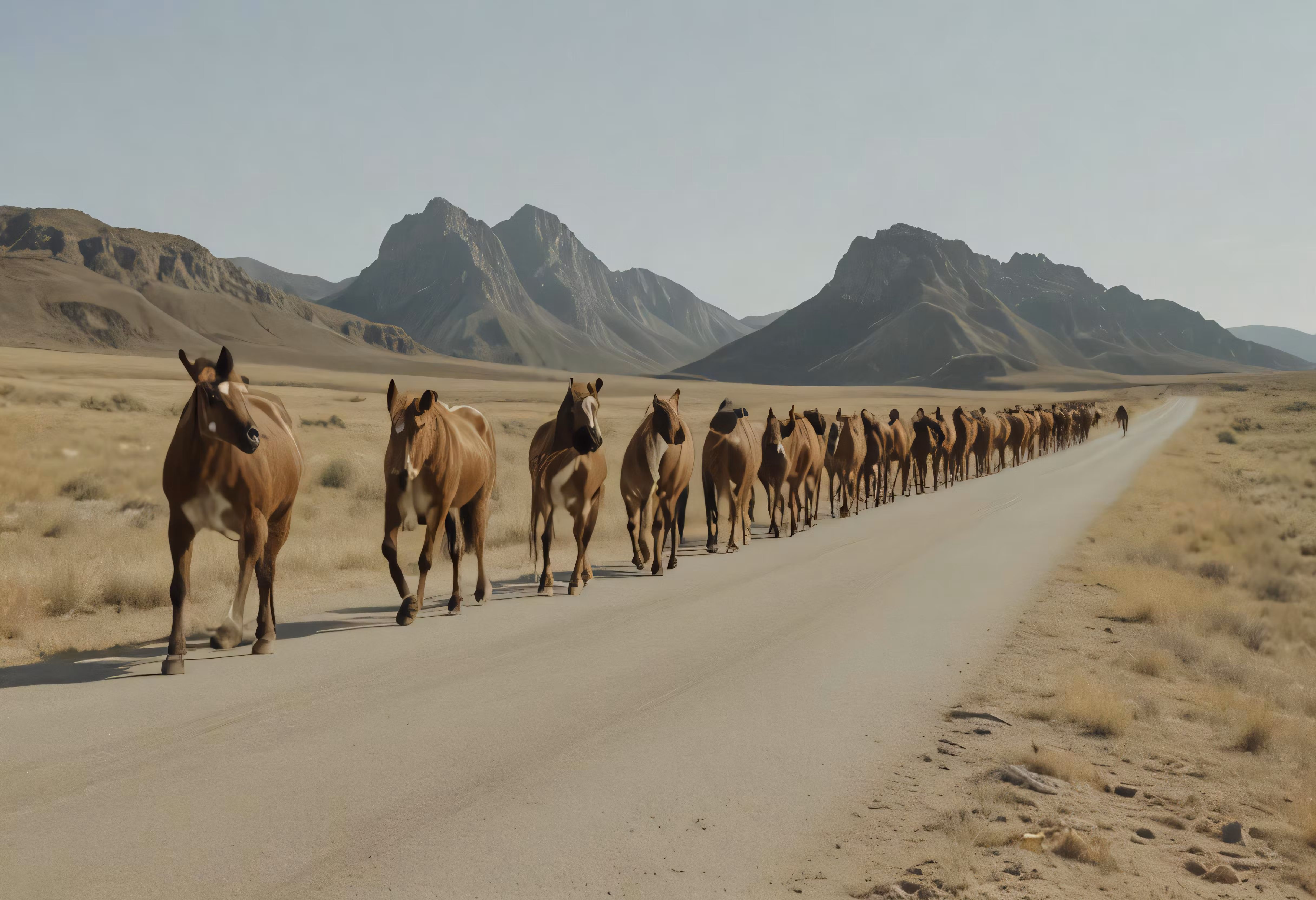 High resolution picture, free to use, a bunch of horses that are walking on a road