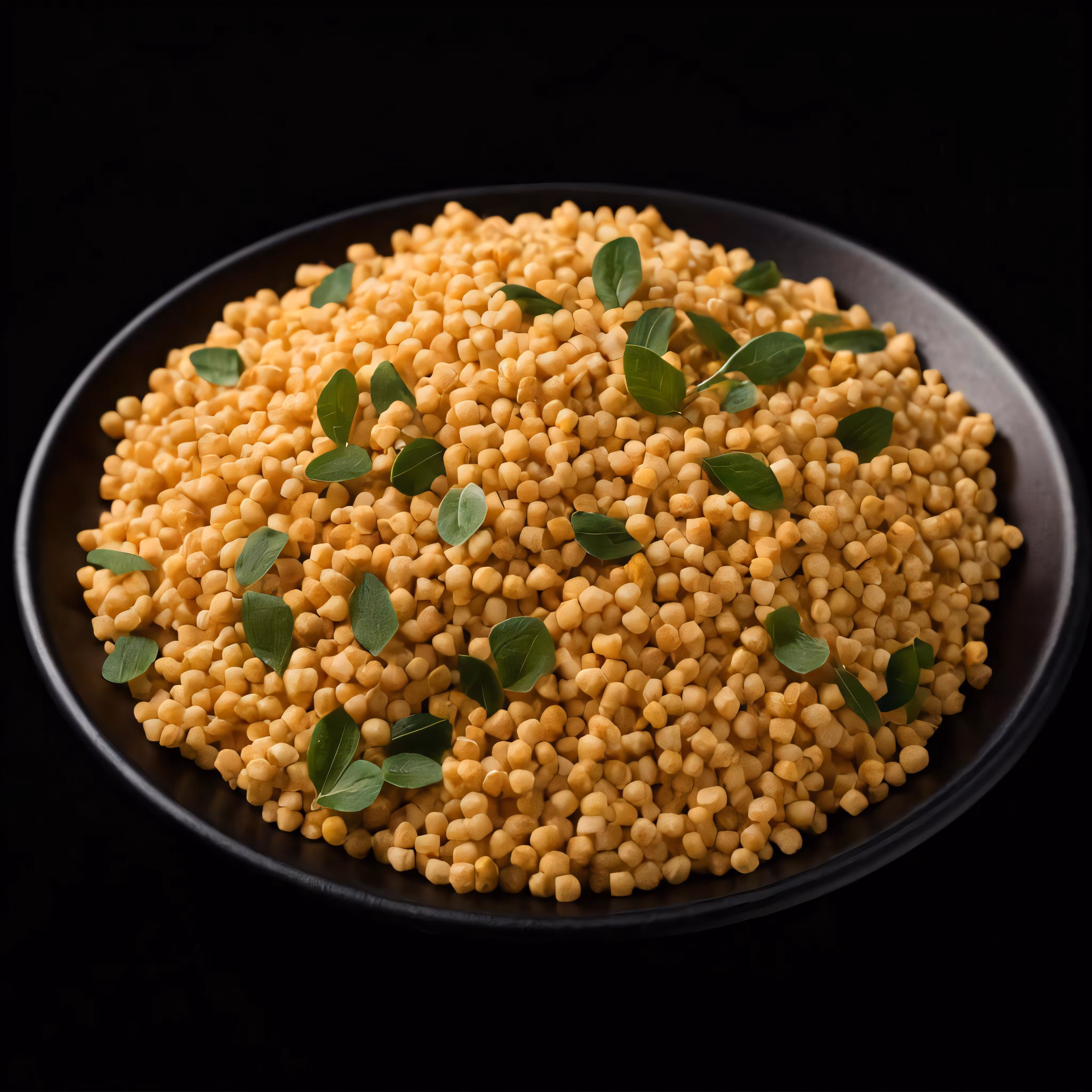 High resolution picture, free to use, a bunch of yellow grains with green leaves on a black plate