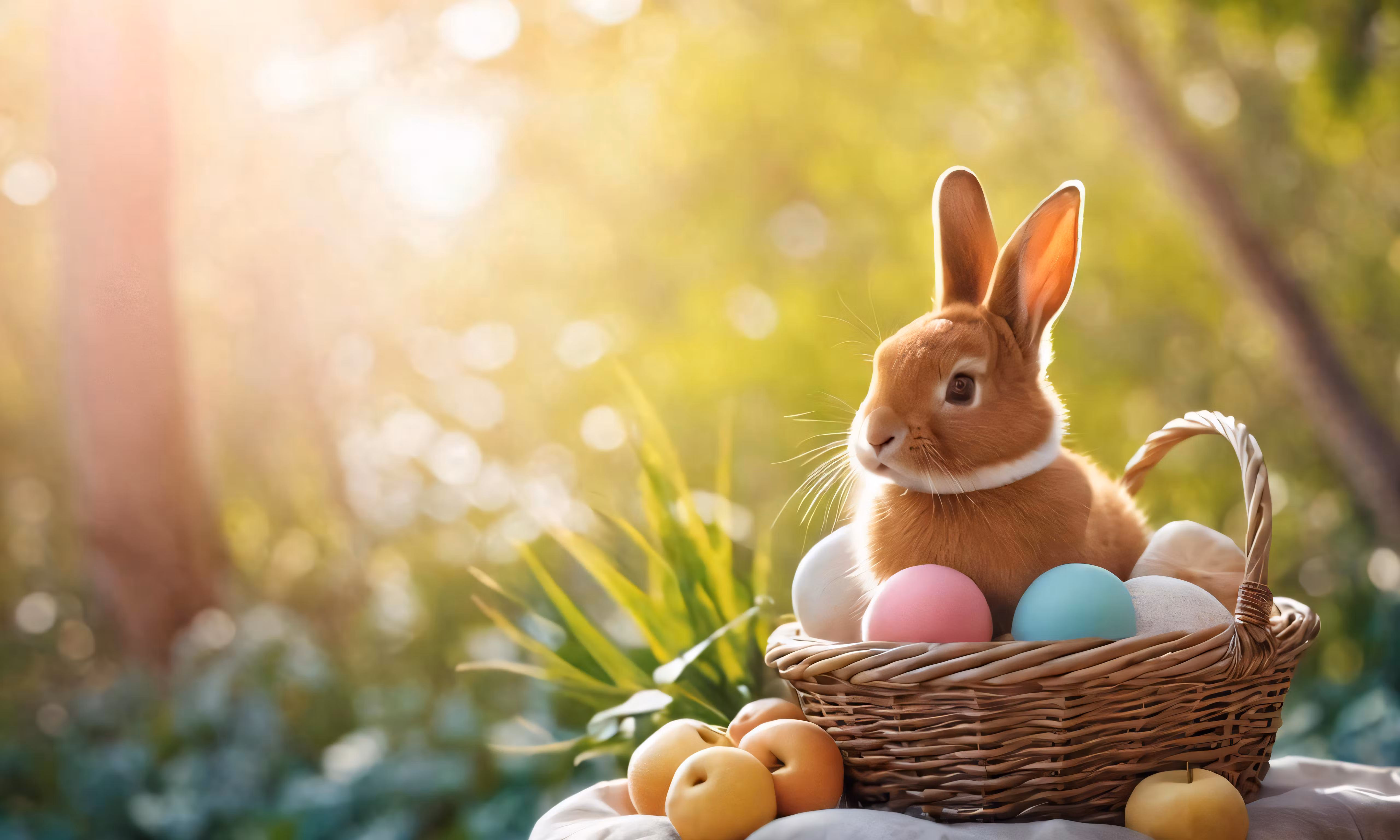 High resolution picture, free to use, a bunny is sitting behind a basket filled with painted eggs
