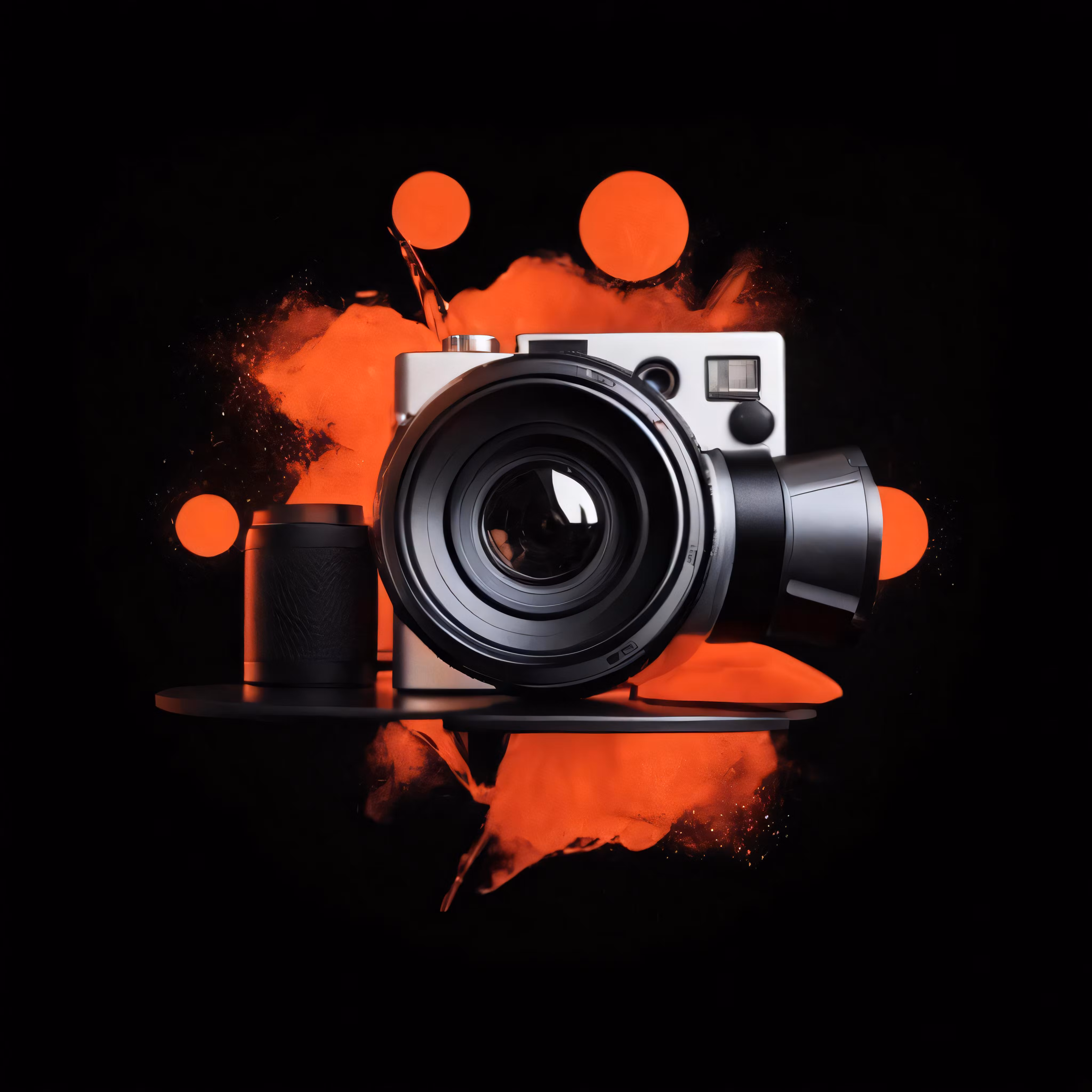 High resolution picture, free to use, a camera and some orange bubbles on black