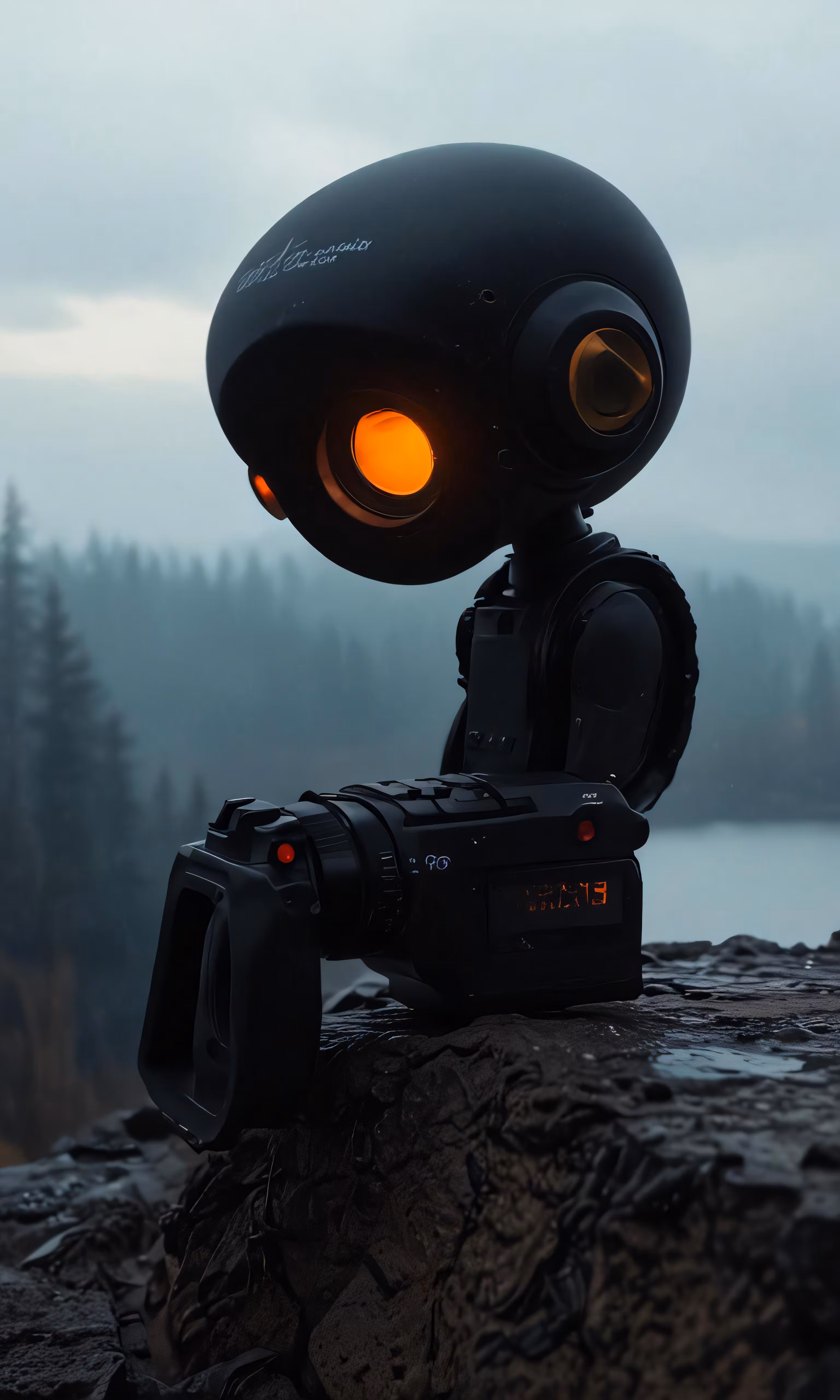 High resolution picture, free to use, a camera with an eye ball on top sitting in front of a body of water