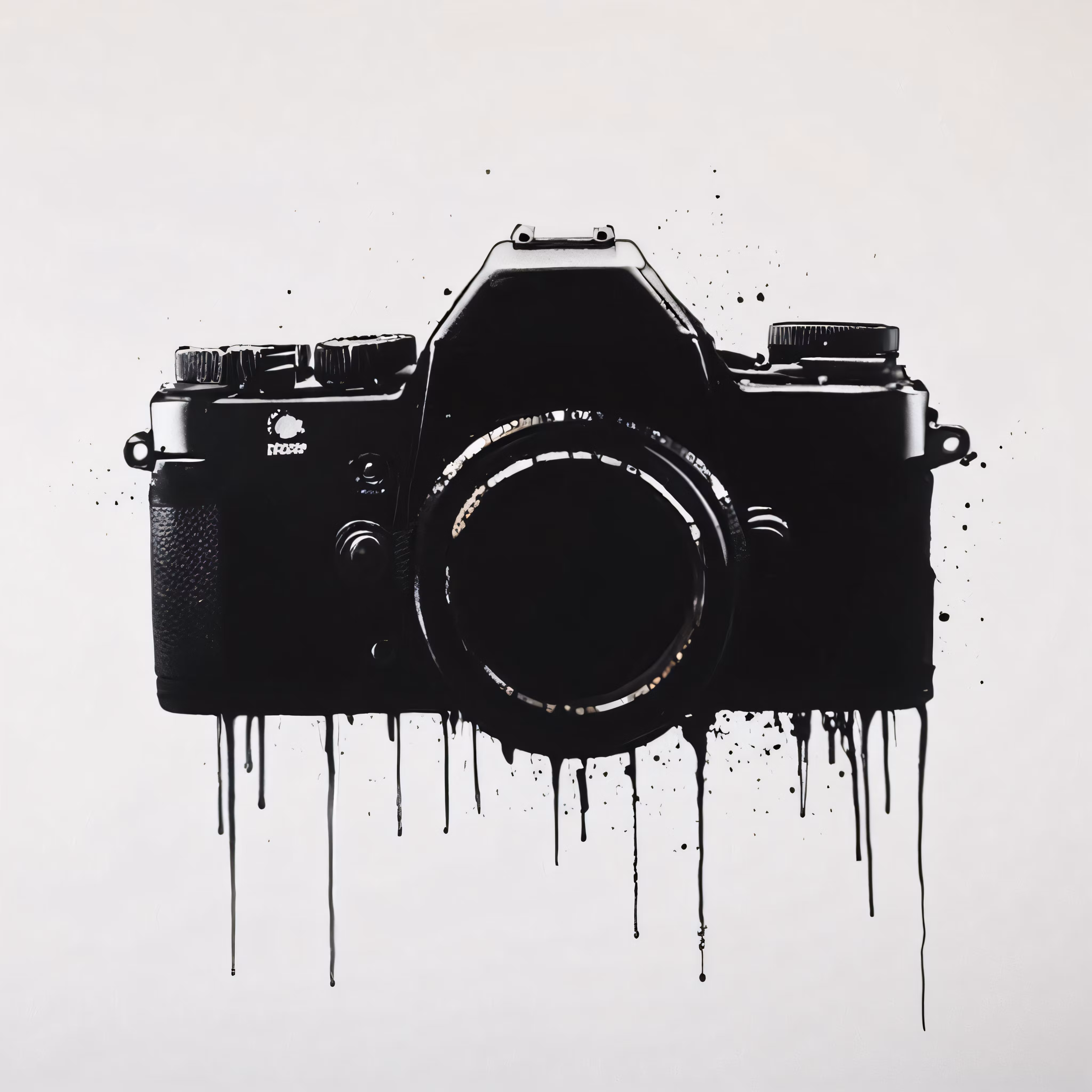 High resolution picture, free to use, a camera with dripping paint on it in front of a wall