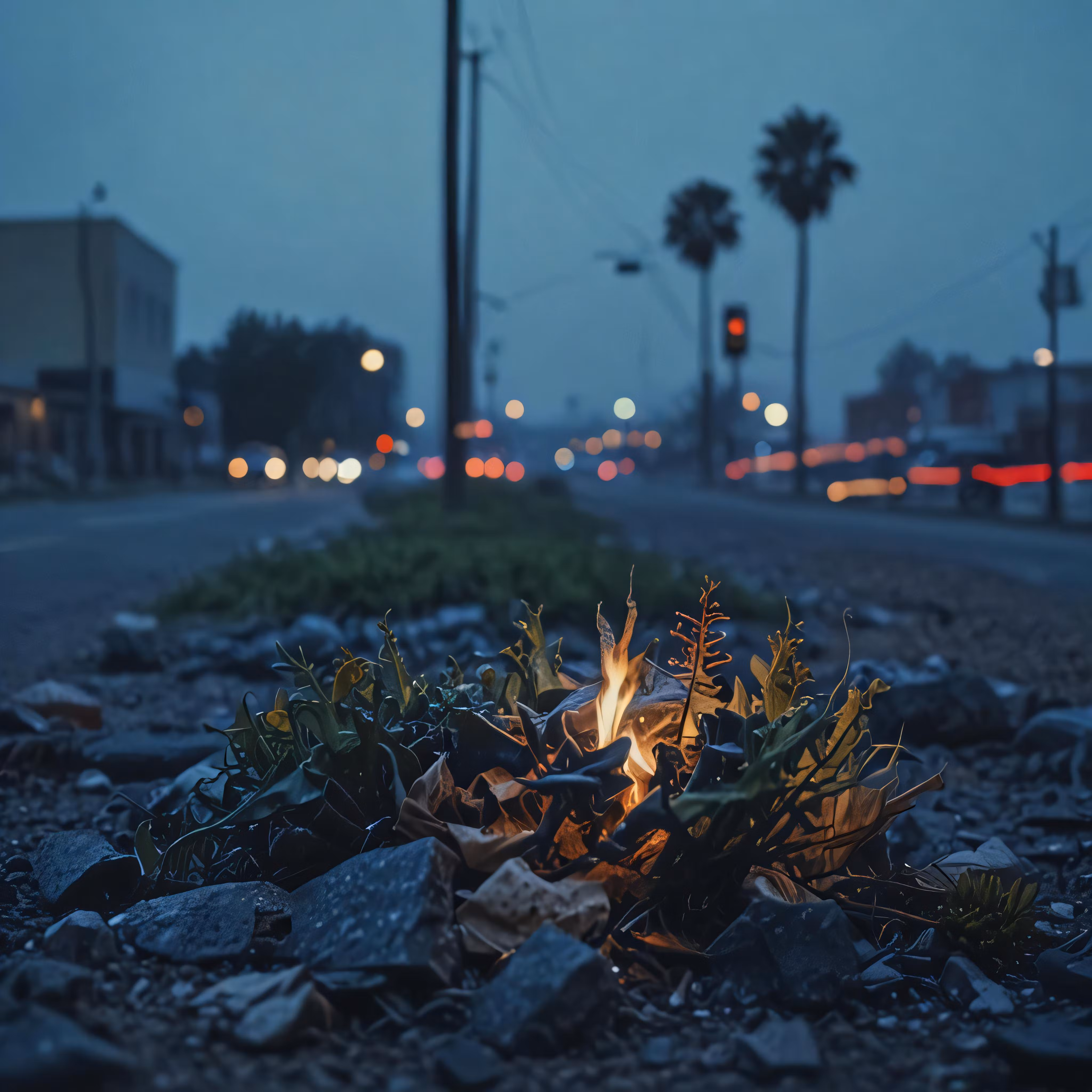 High resolution picture, free to use, a campfire on the side of a city street at night
