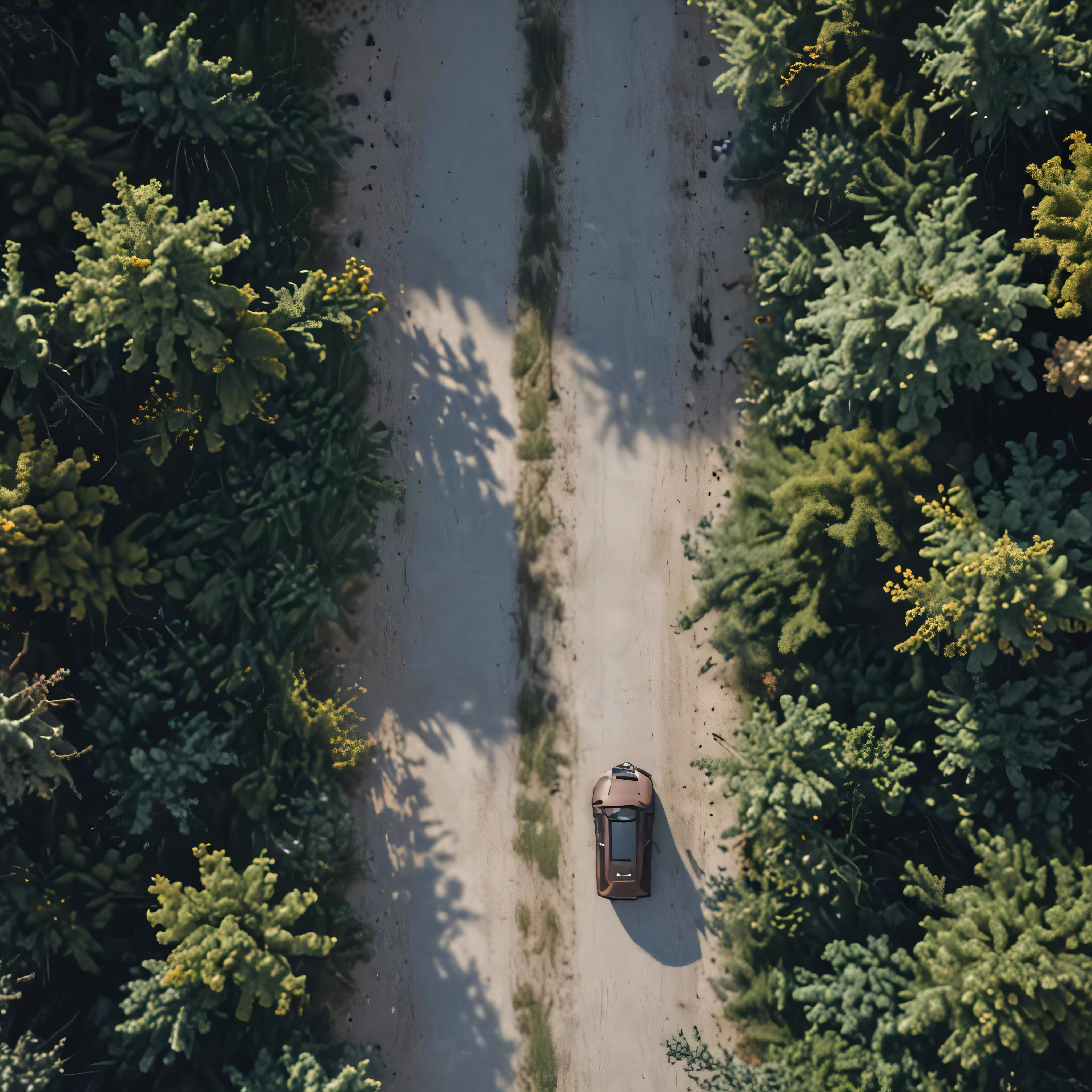 High resolution picture, free to use, a car is parked on the dirt road surrounded by trees
