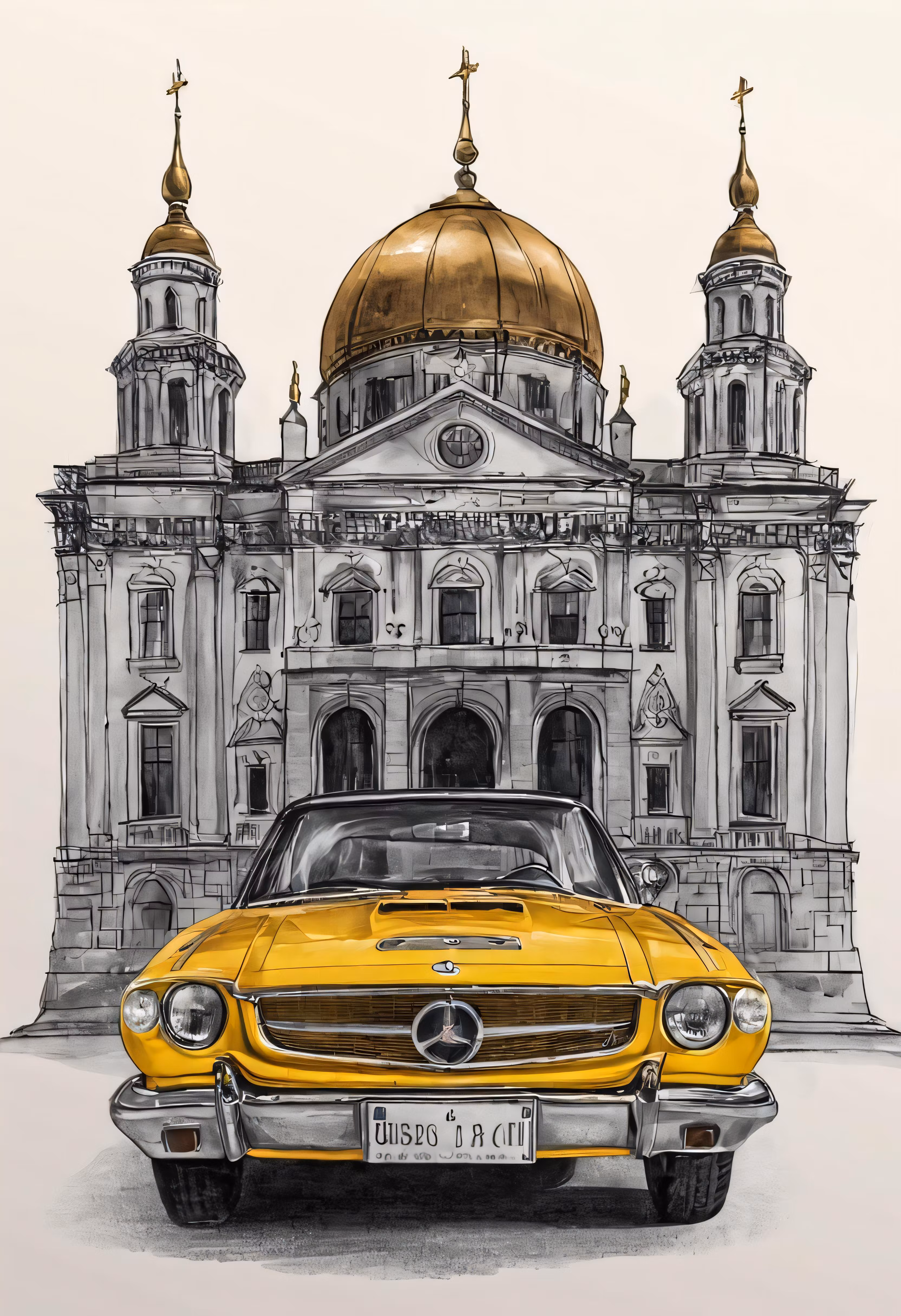 High resolution picture, free to use, a car is shown parked in front of a large church