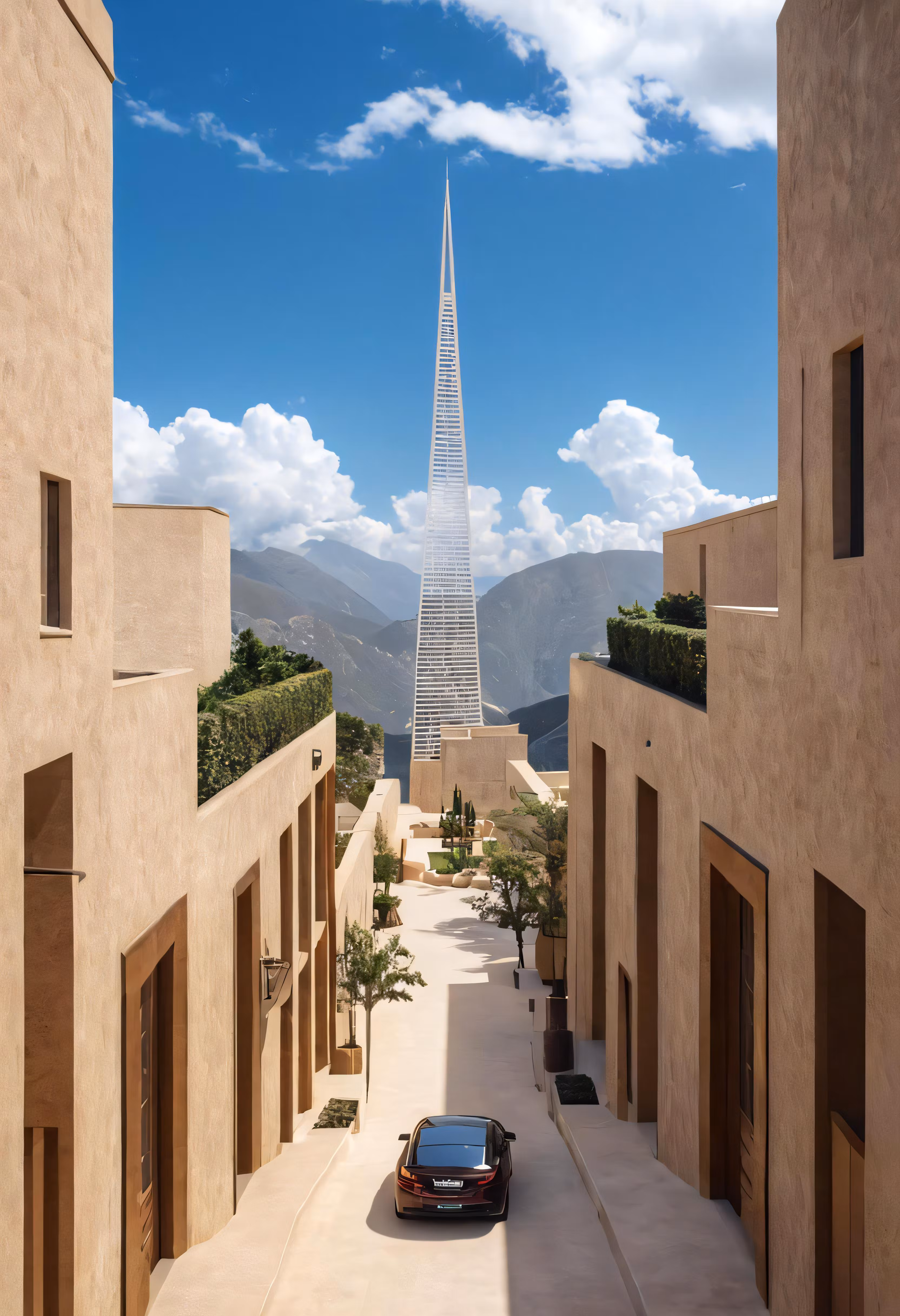 High resolution picture, free to use, a car parked in between two buildings with a street and a tower on the far side