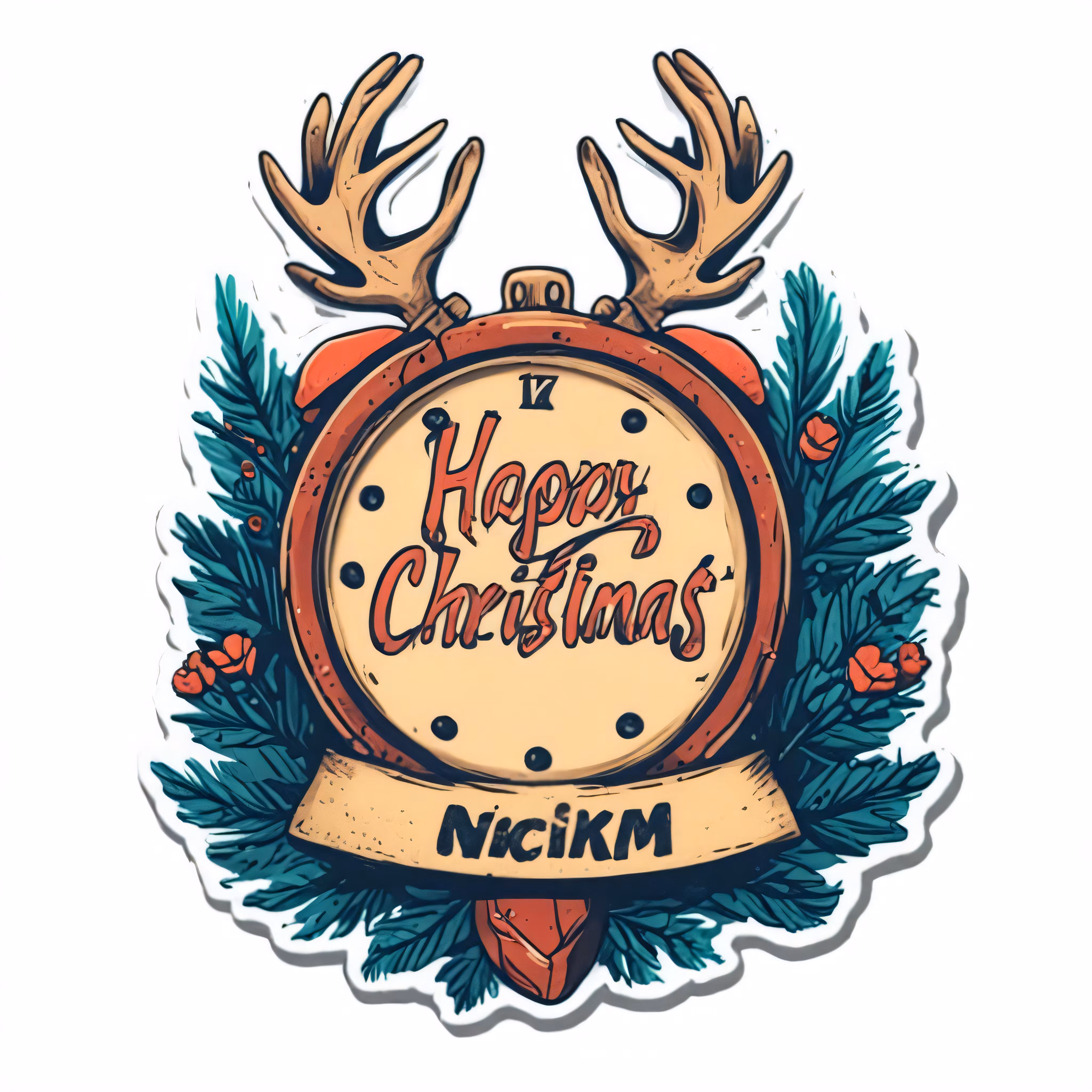 High resolution picture, free to use, a cartoon   style clock with antlers and words that say happy christmas nickm