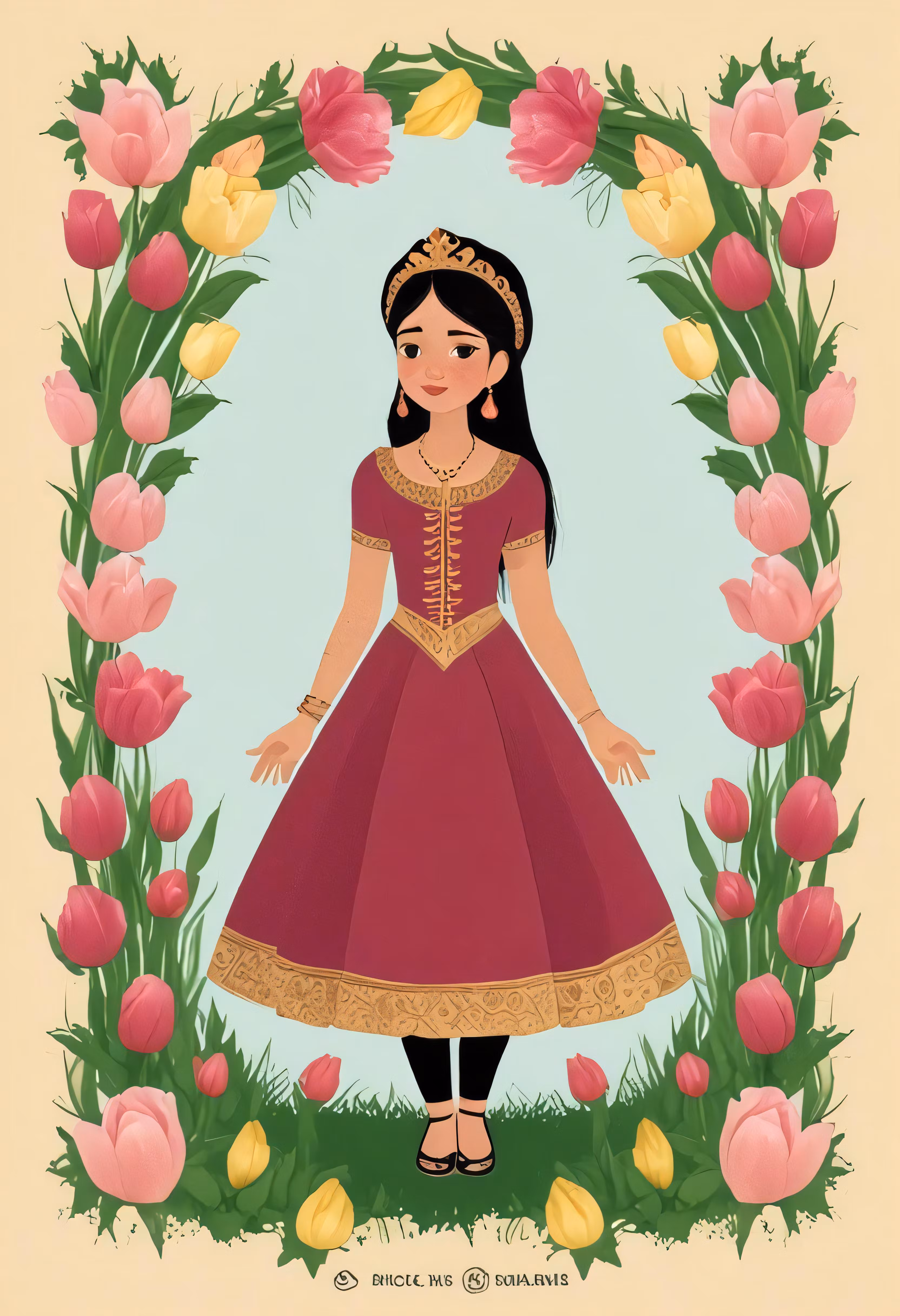 High resolution picture, free to use, a cartoon character dressed in a red dress surrounded by flowers