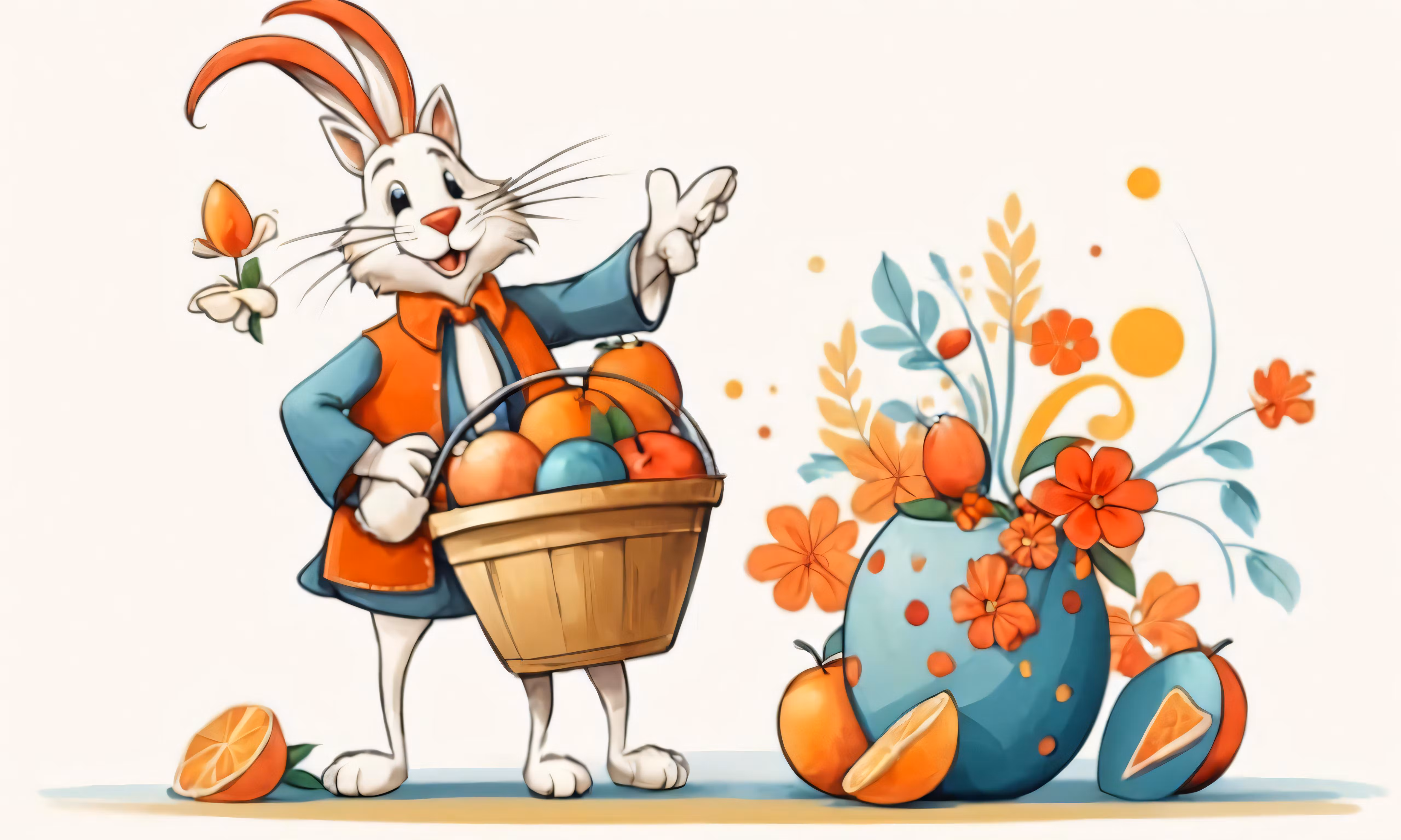 High resolution picture, free to use, a cartoon character is holding a basket full of eggs