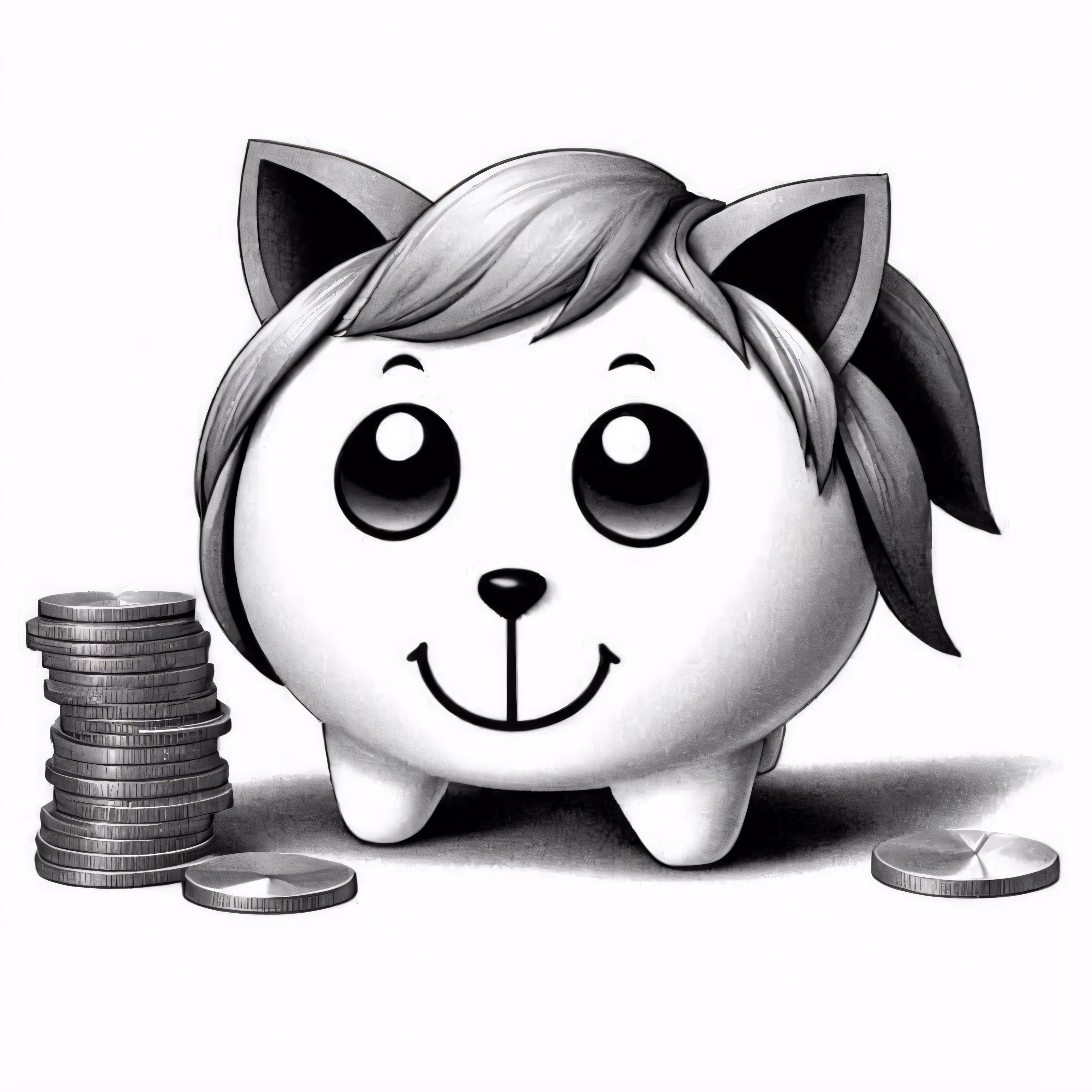 High resolution picture, free to use, a cartoon dog that is surrounded by stacks of coins