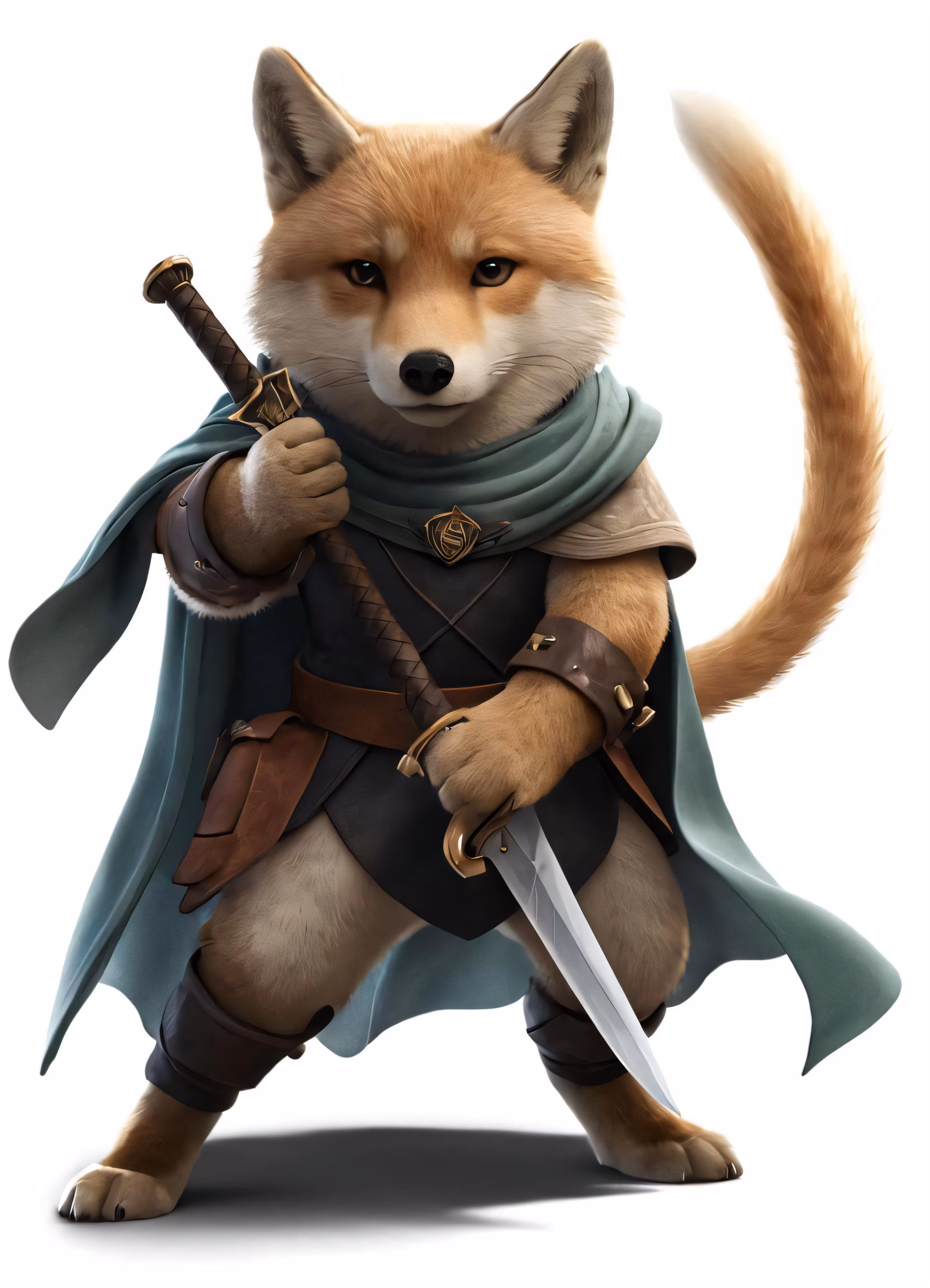 High resolution picture, free to use, a cartoon fox dressed in armor holding a sword