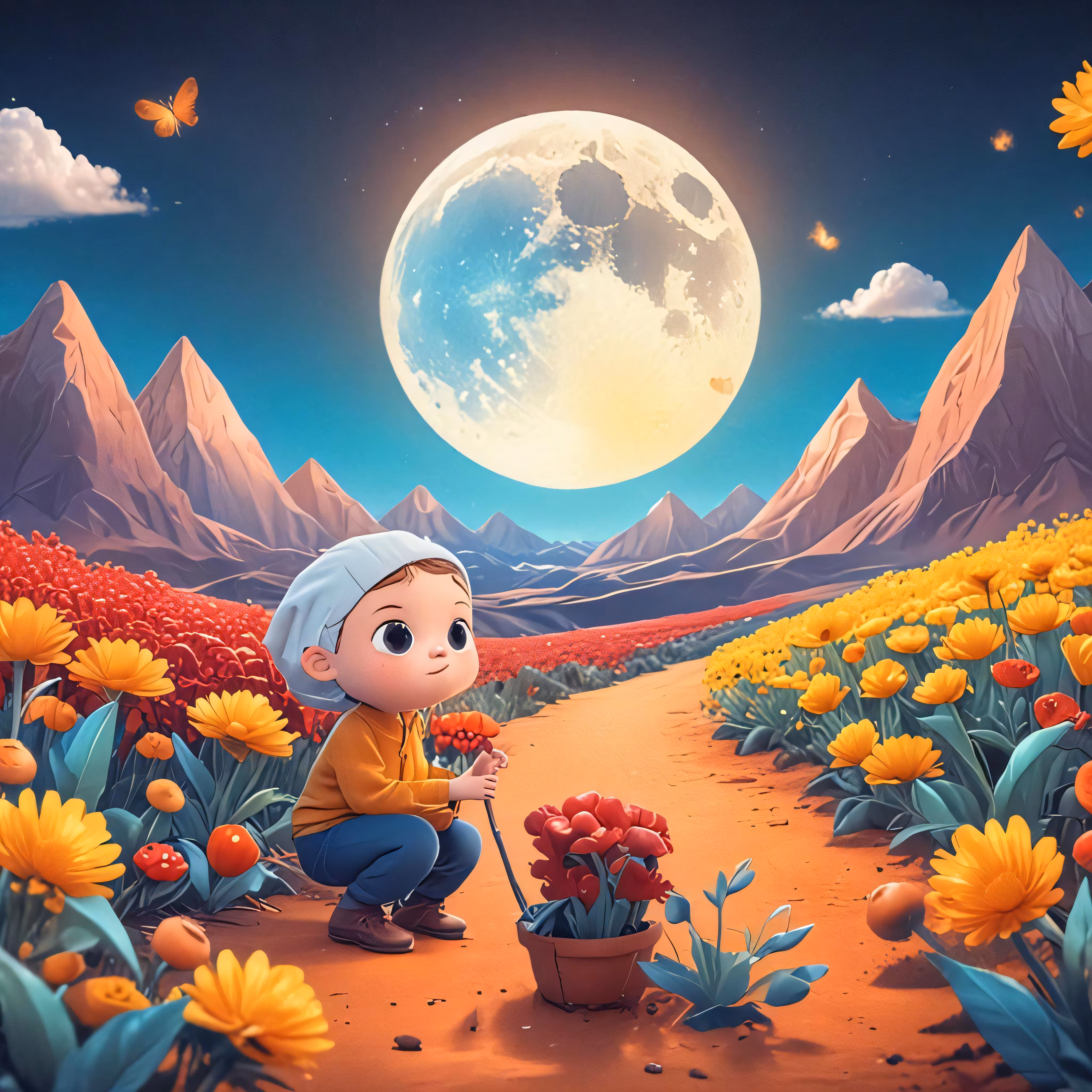 High resolution picture, free to use, a cartoon is standing in the field with flowers