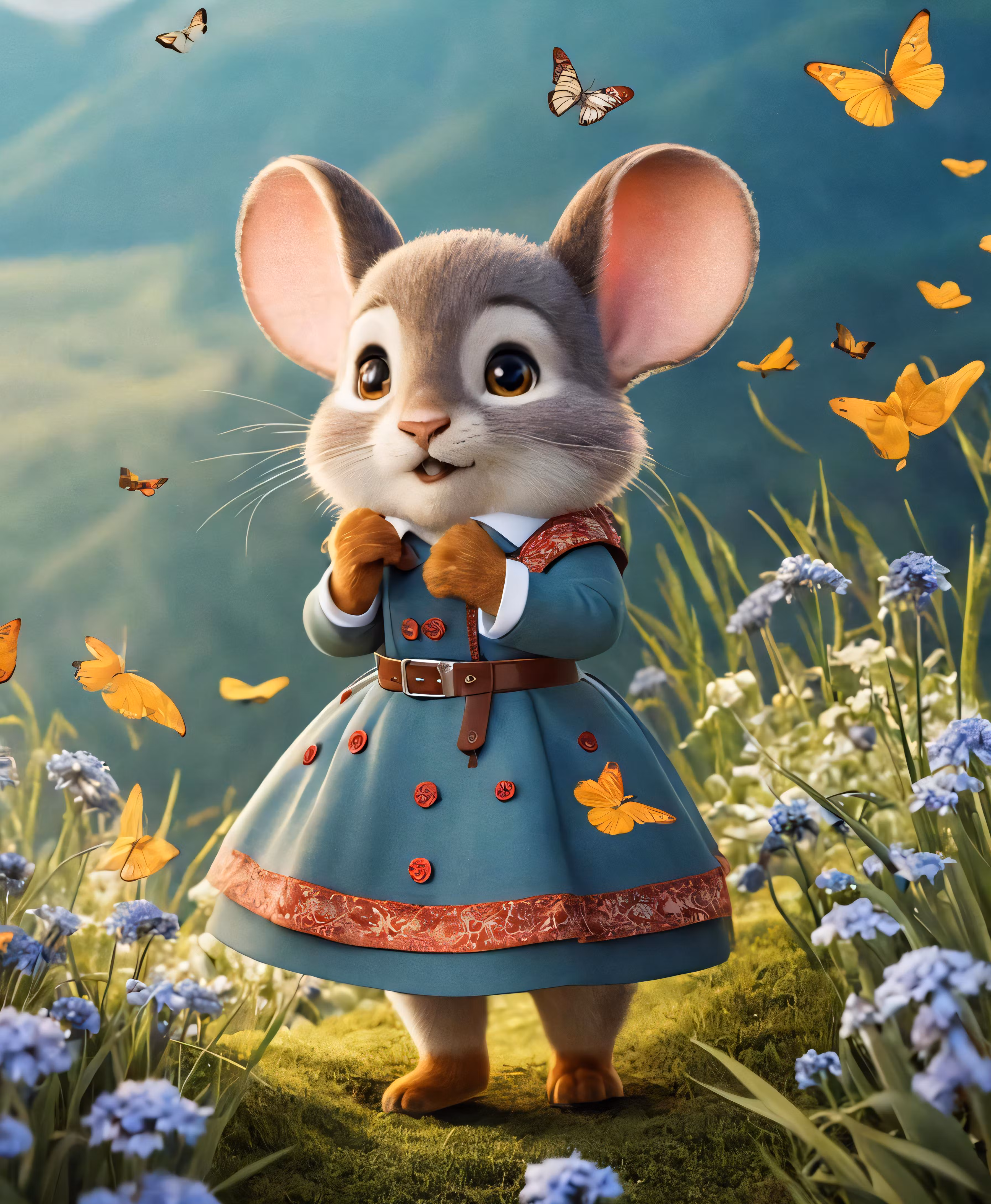 High resolution picture, free to use, a cartoon rat in a blue dress surrounded by butterflies