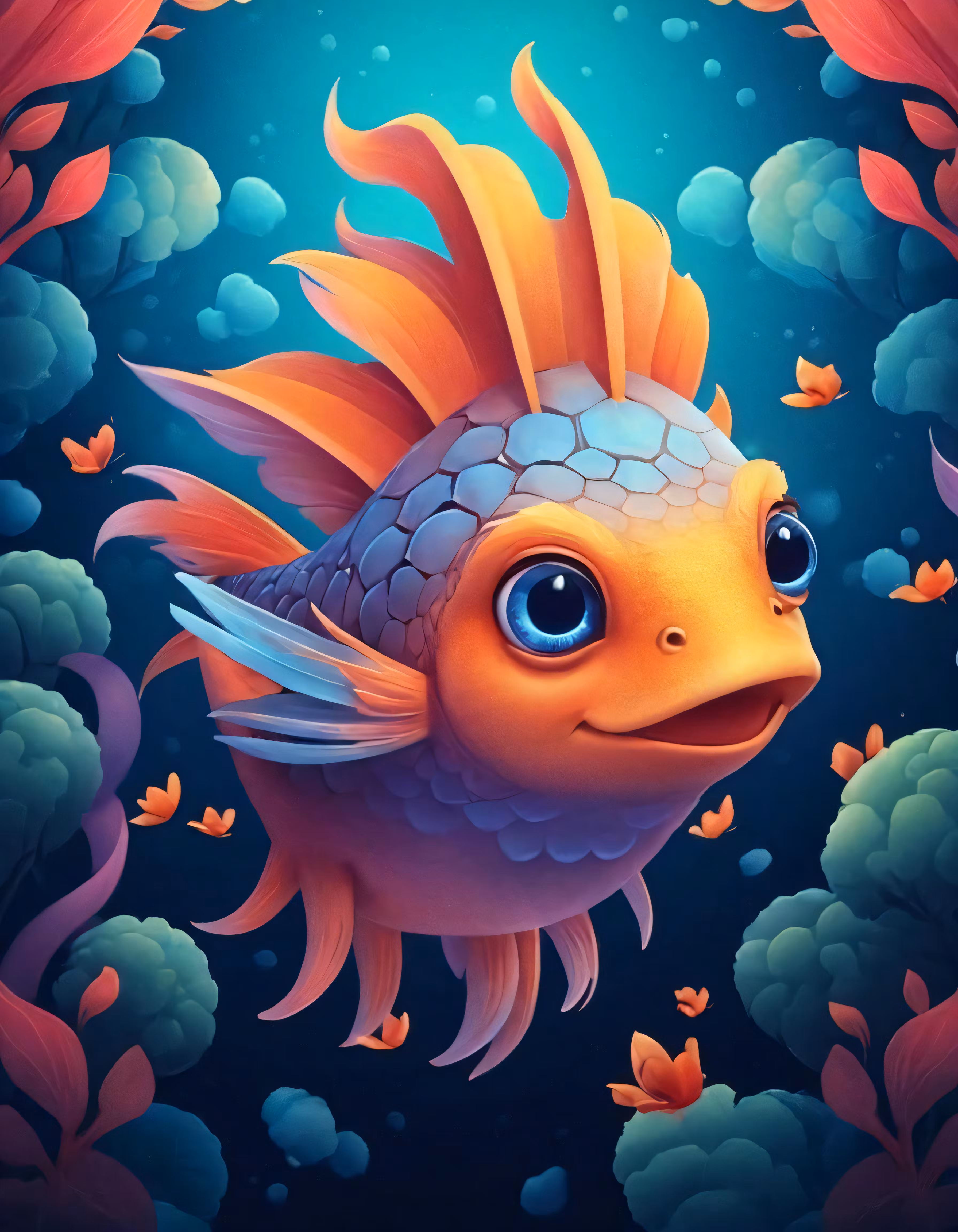 High resolution picture, free to use, a cartoon style fish with bright blue eyes is shown against the backdrop of colorful algae