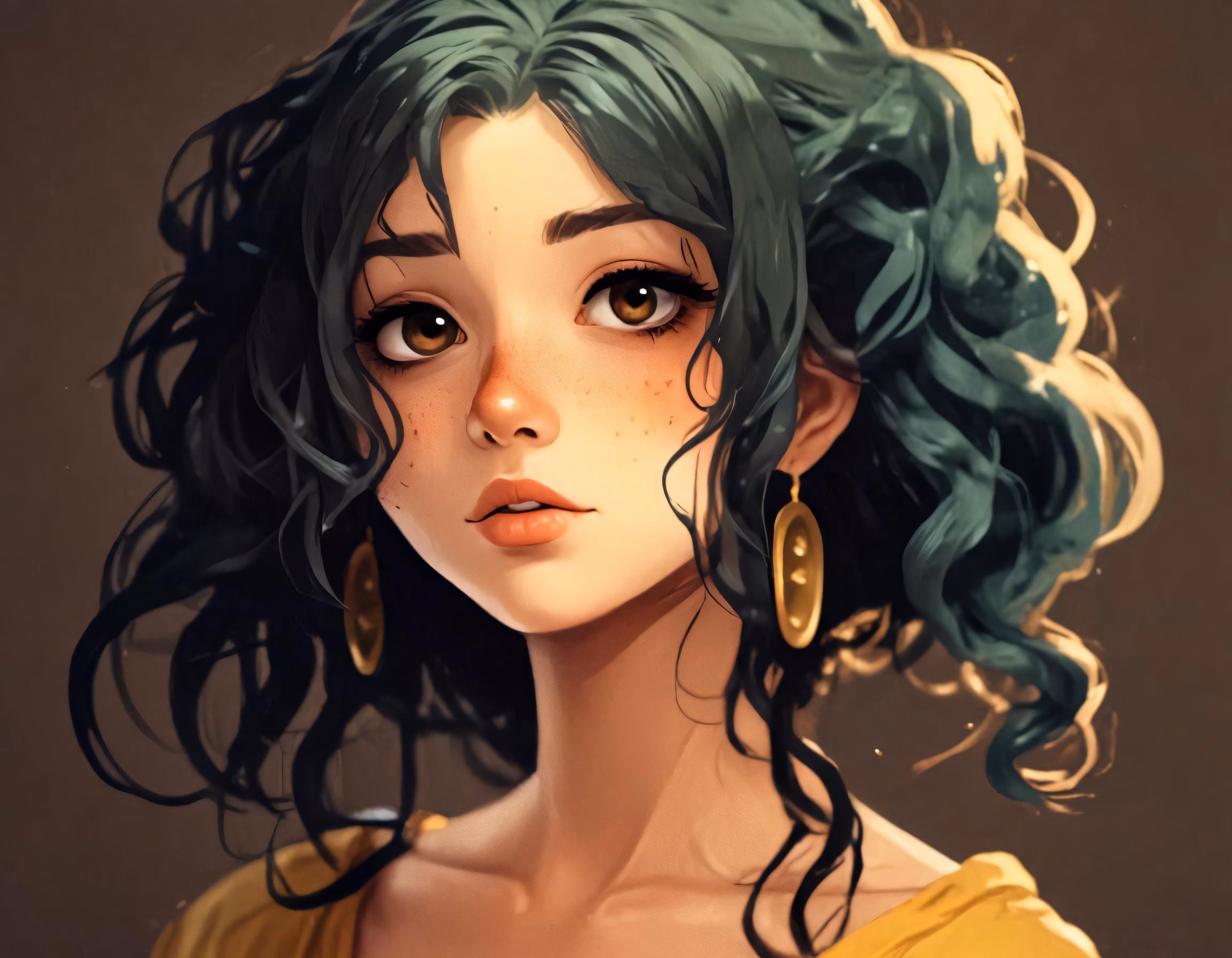 High resolution picture, free to use, a cartoon style woman with green hair wearing gold earrings