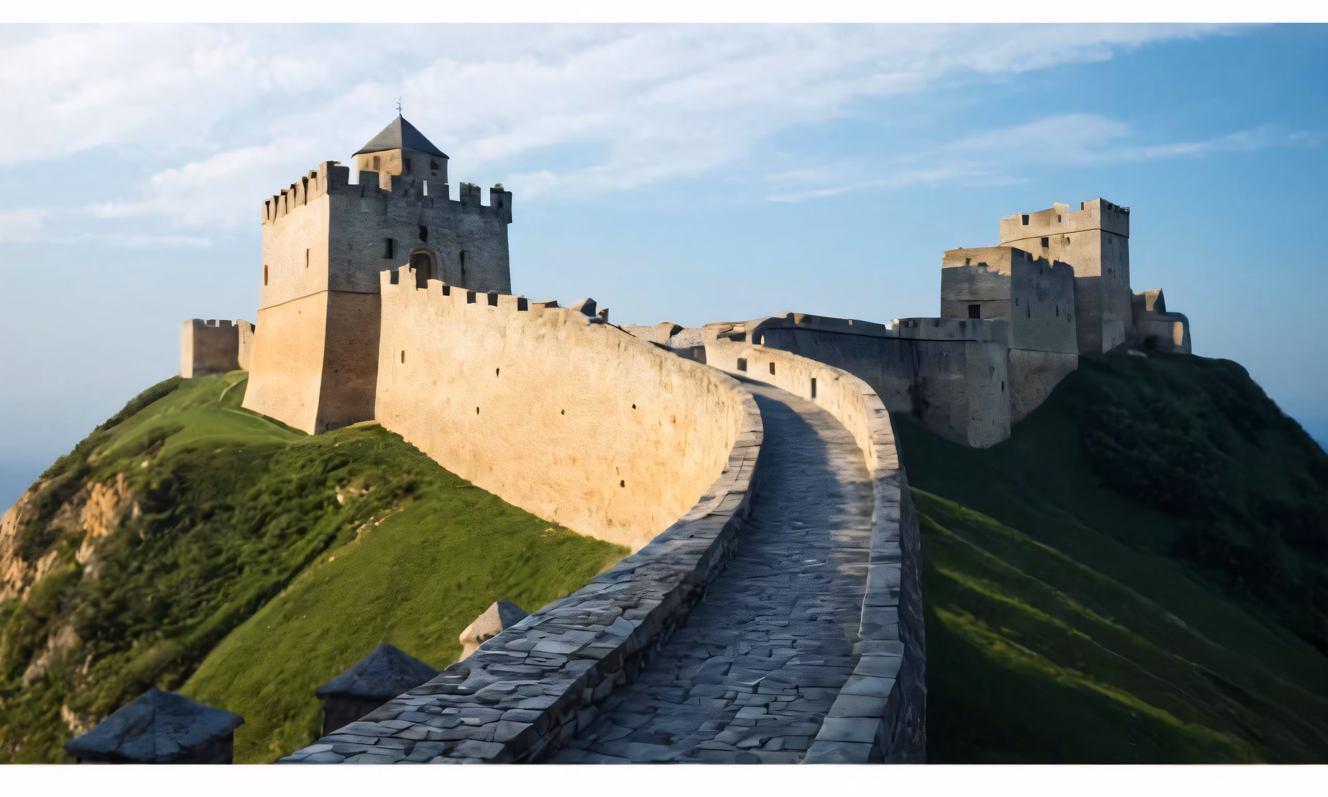 High resolution picture, free to use, a castle on a green hillside with a long path leading to the towers