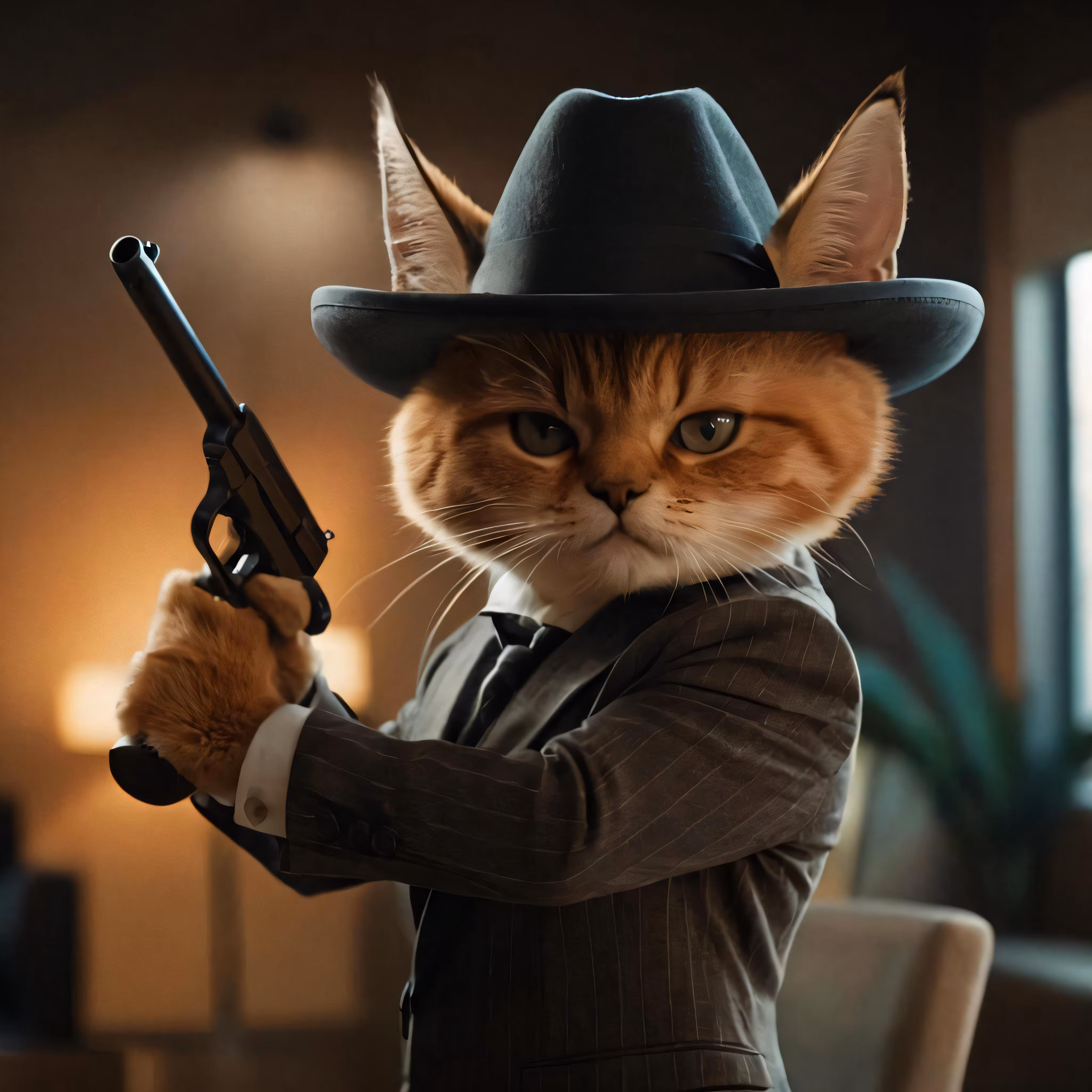 High resolution picture, free to use, a cat dressed in a suit, hat and holding a rifle