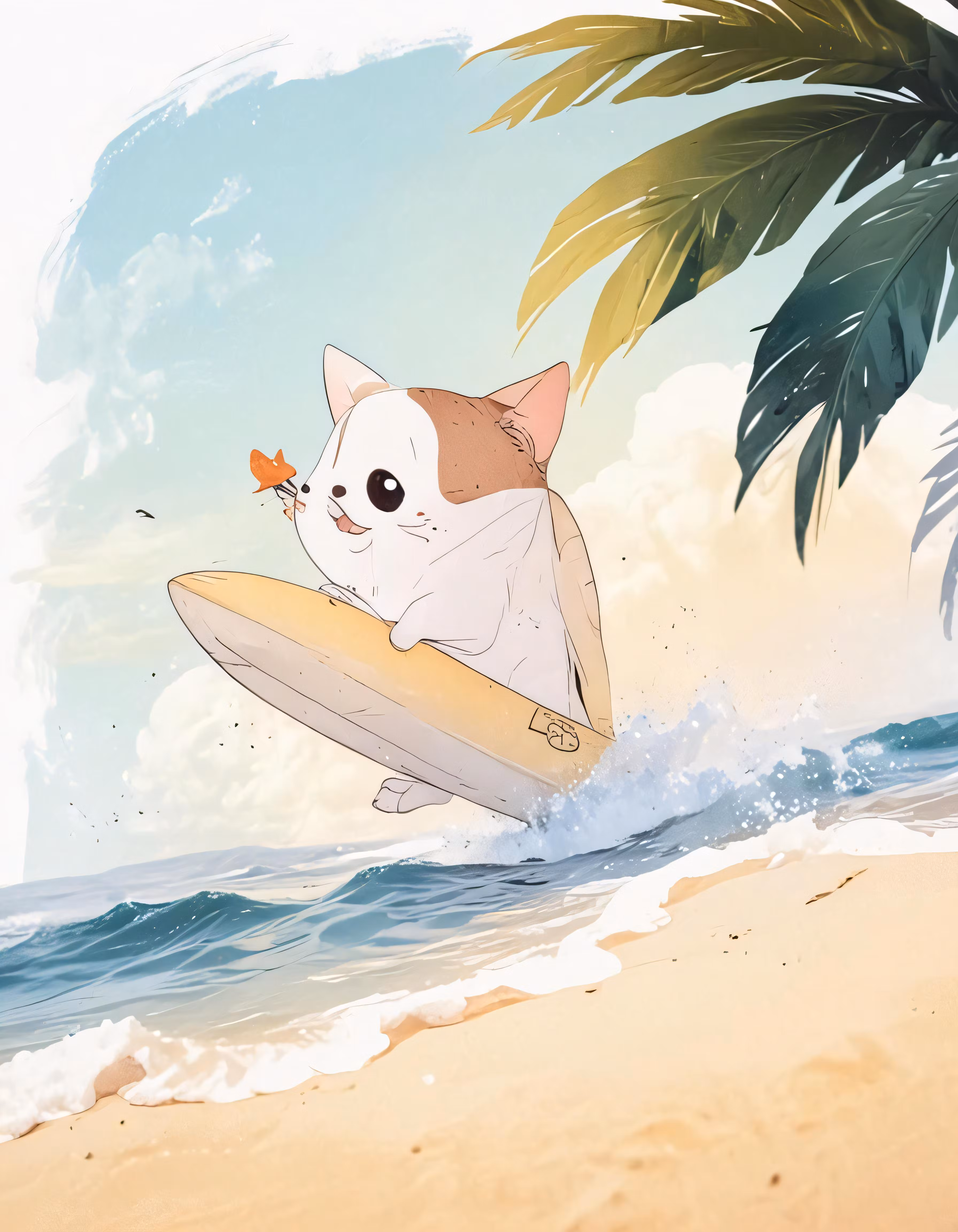 High resolution picture, free to use, a cat flying on top of a surfboard on the beach