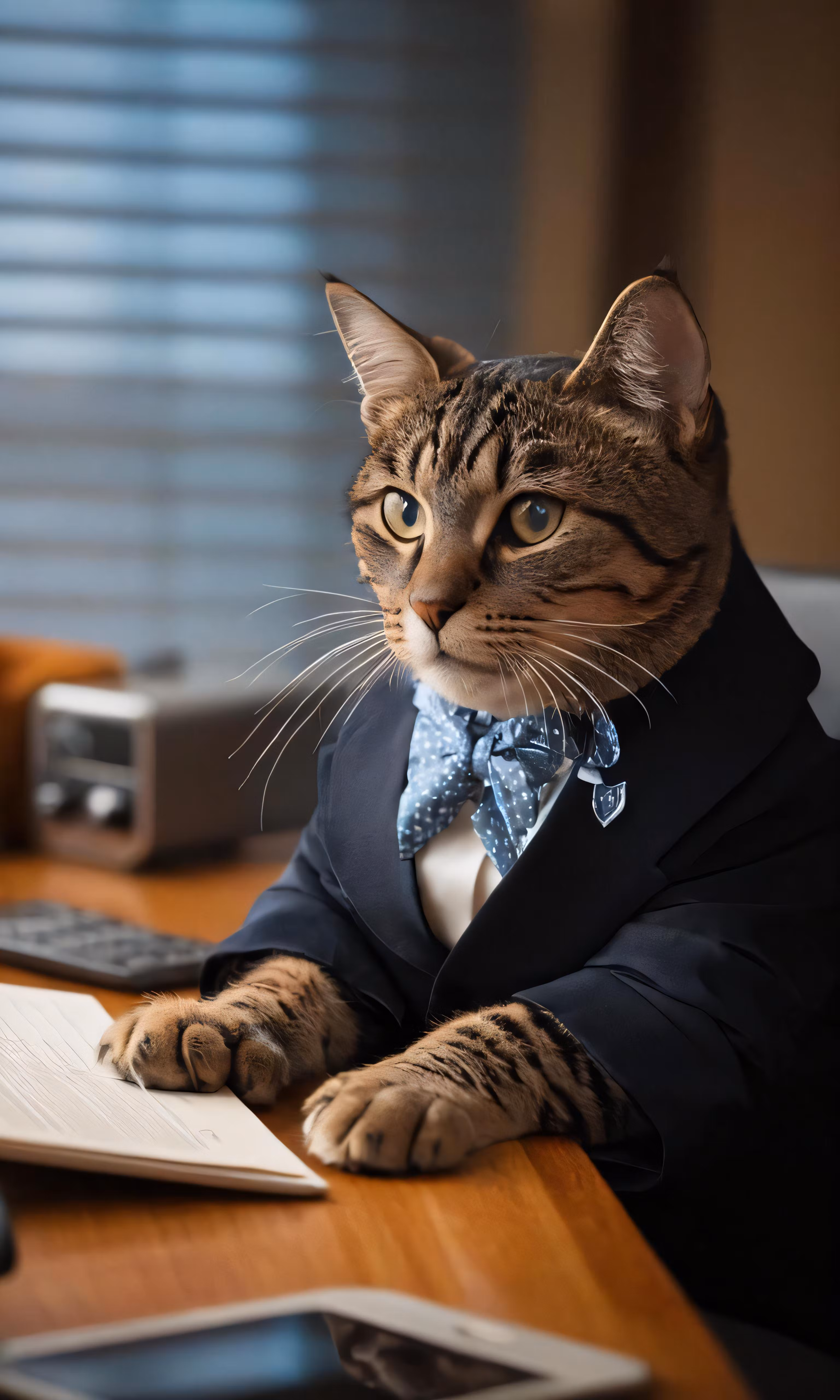 High resolution picture, free to use, a cat in a tuxedo and holding a piece of paper