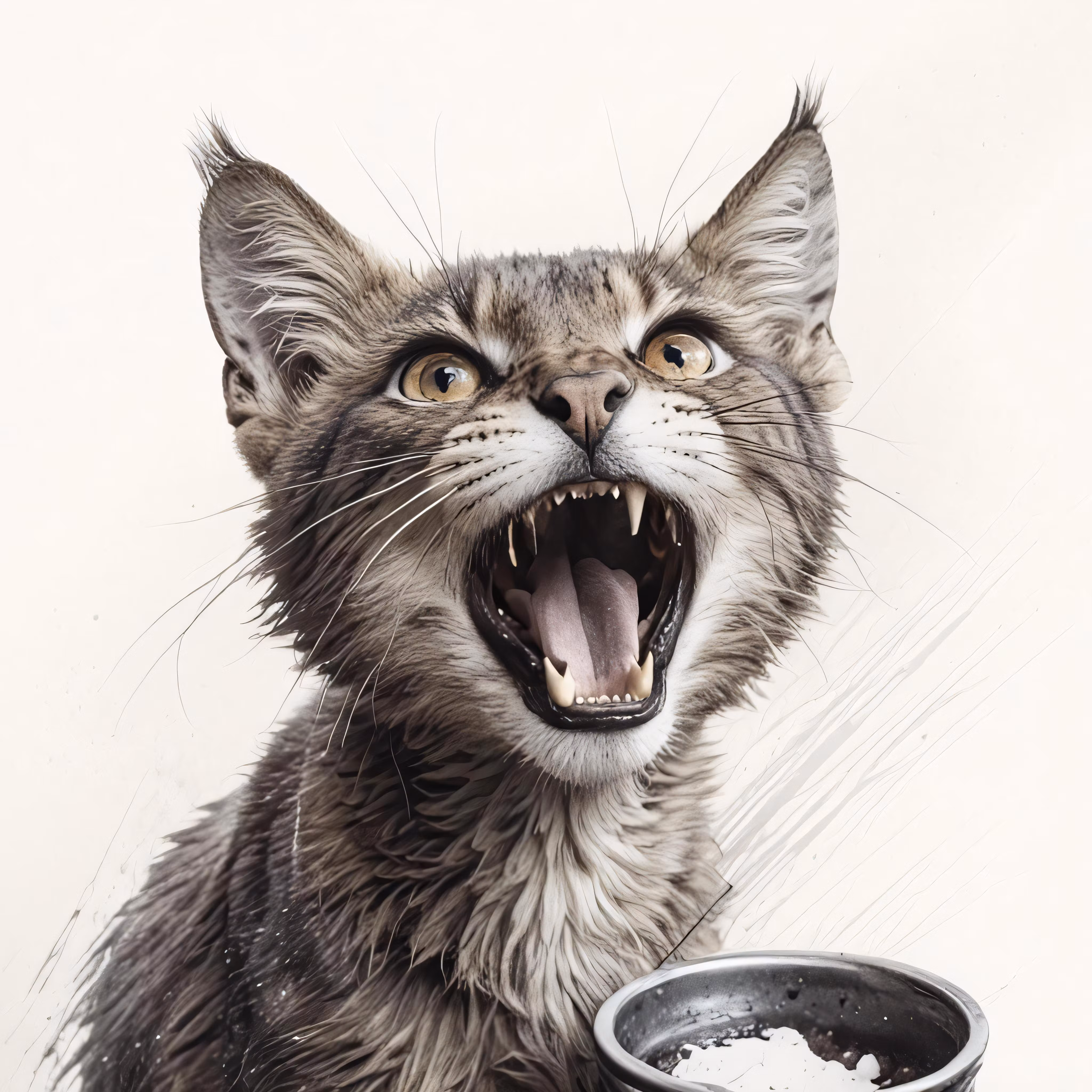 High resolution picture, free to use, a cat is hissing its teeth and in the bowl