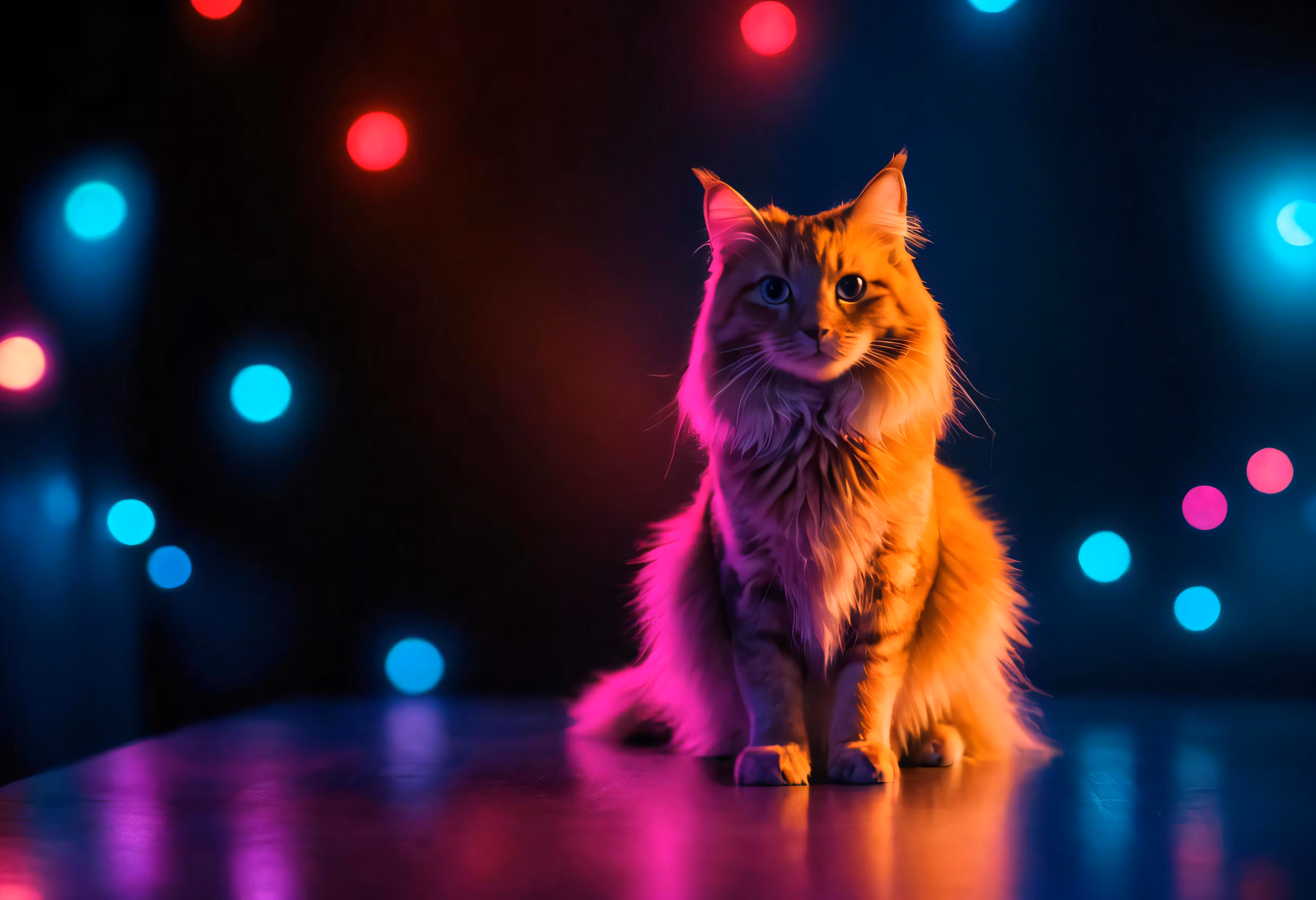 High resolution picture, free to use, a cat sitting in front of a background filled with bright colored lights