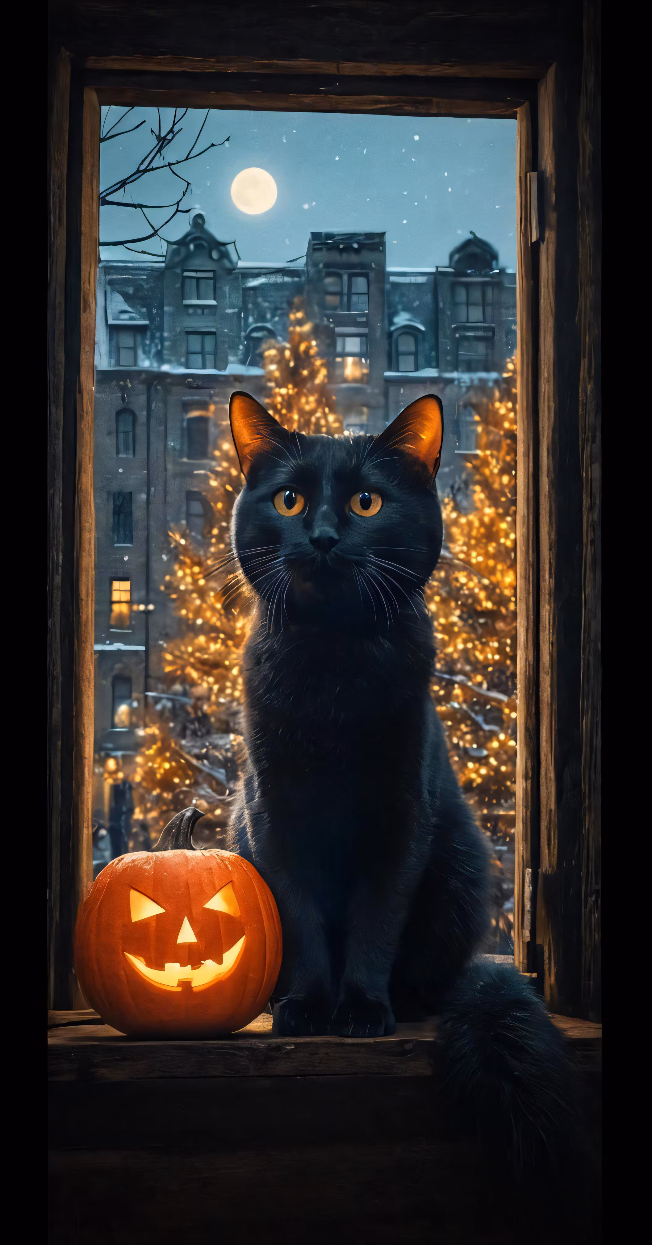 High resolution picture, free to use, a cat sitting in front of a window with a carved pumpkin next to it