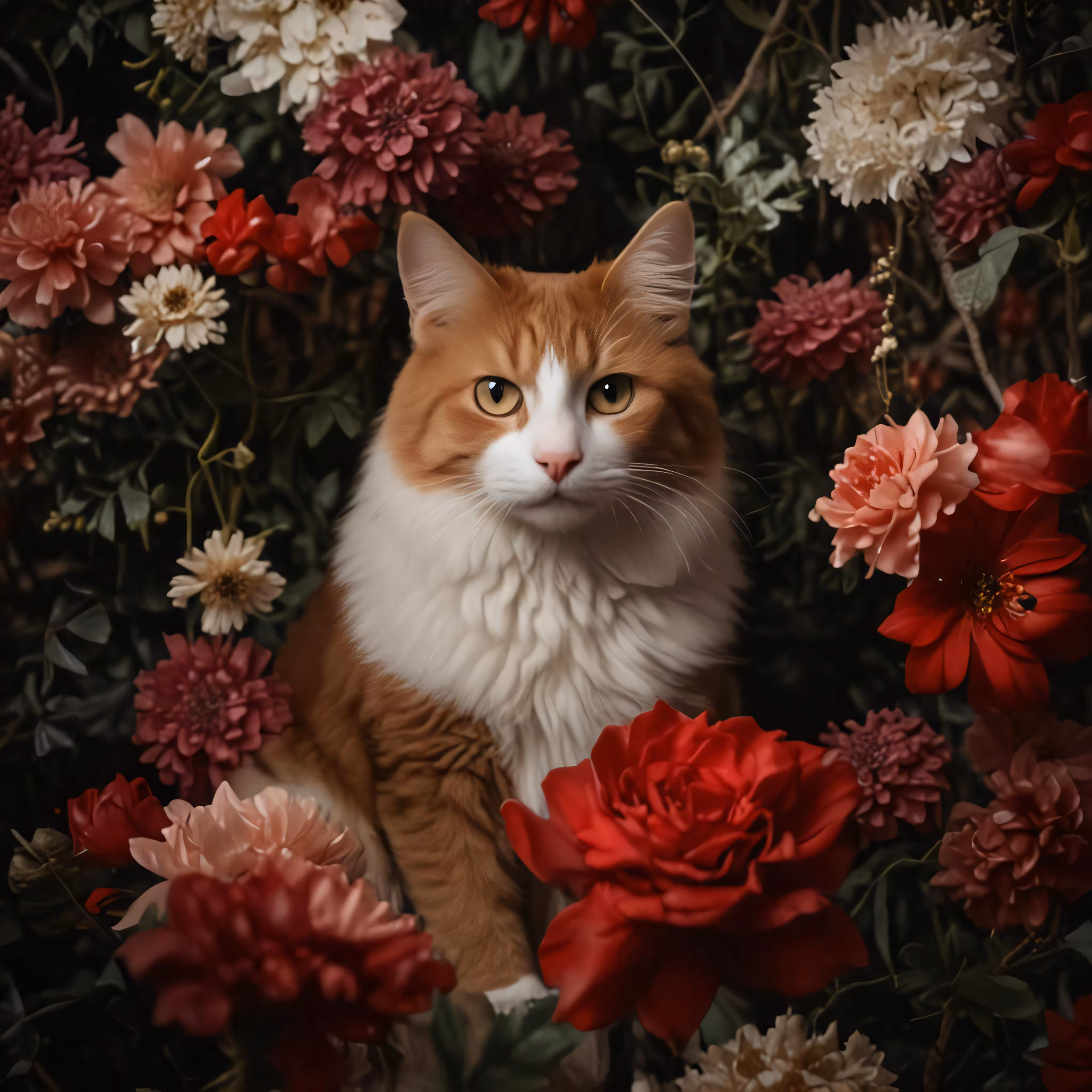 High resolution picture, free to use, a cat sitting in some flowers looking at the camera