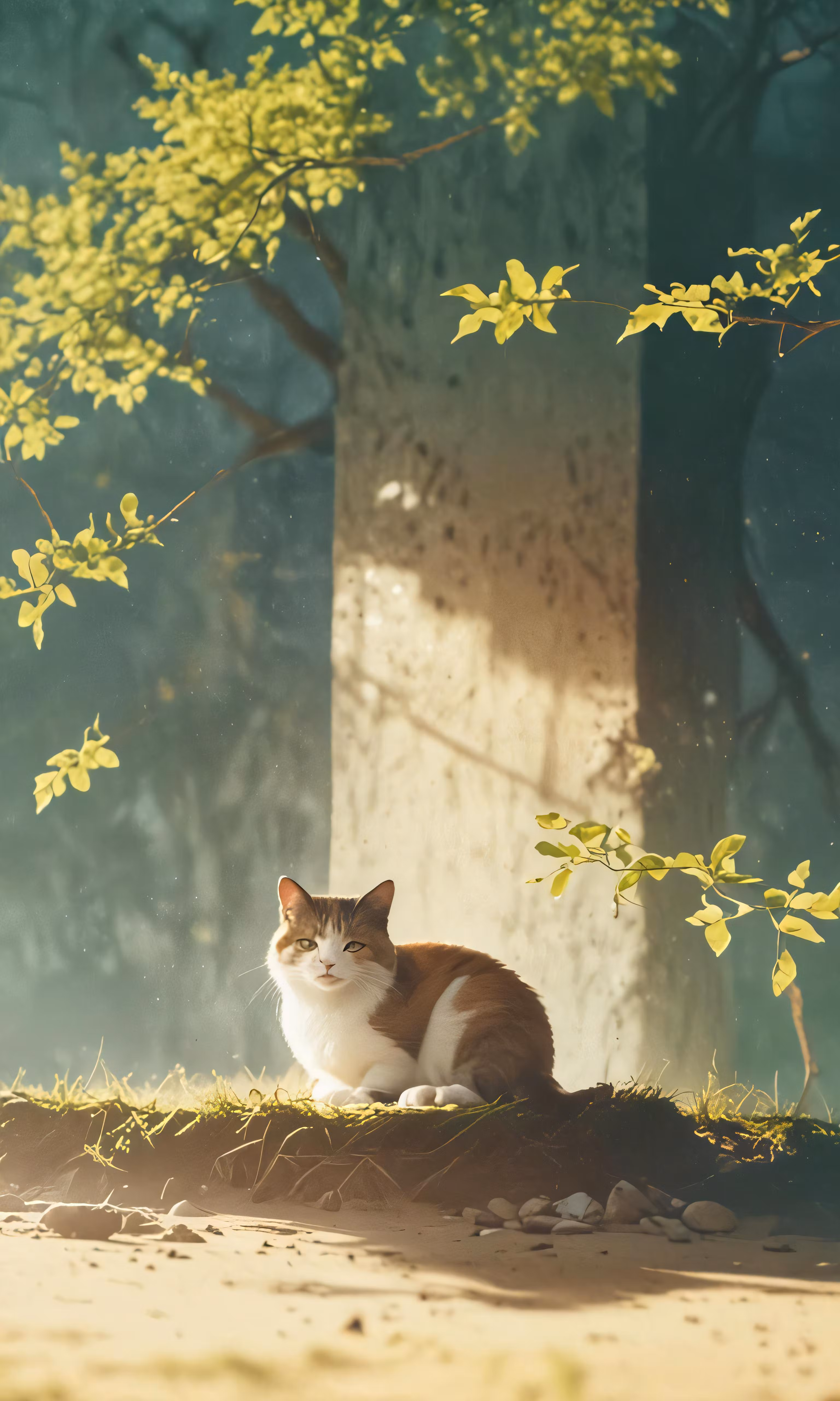 High resolution picture, free to use, a cat sitting on the ground near a tree