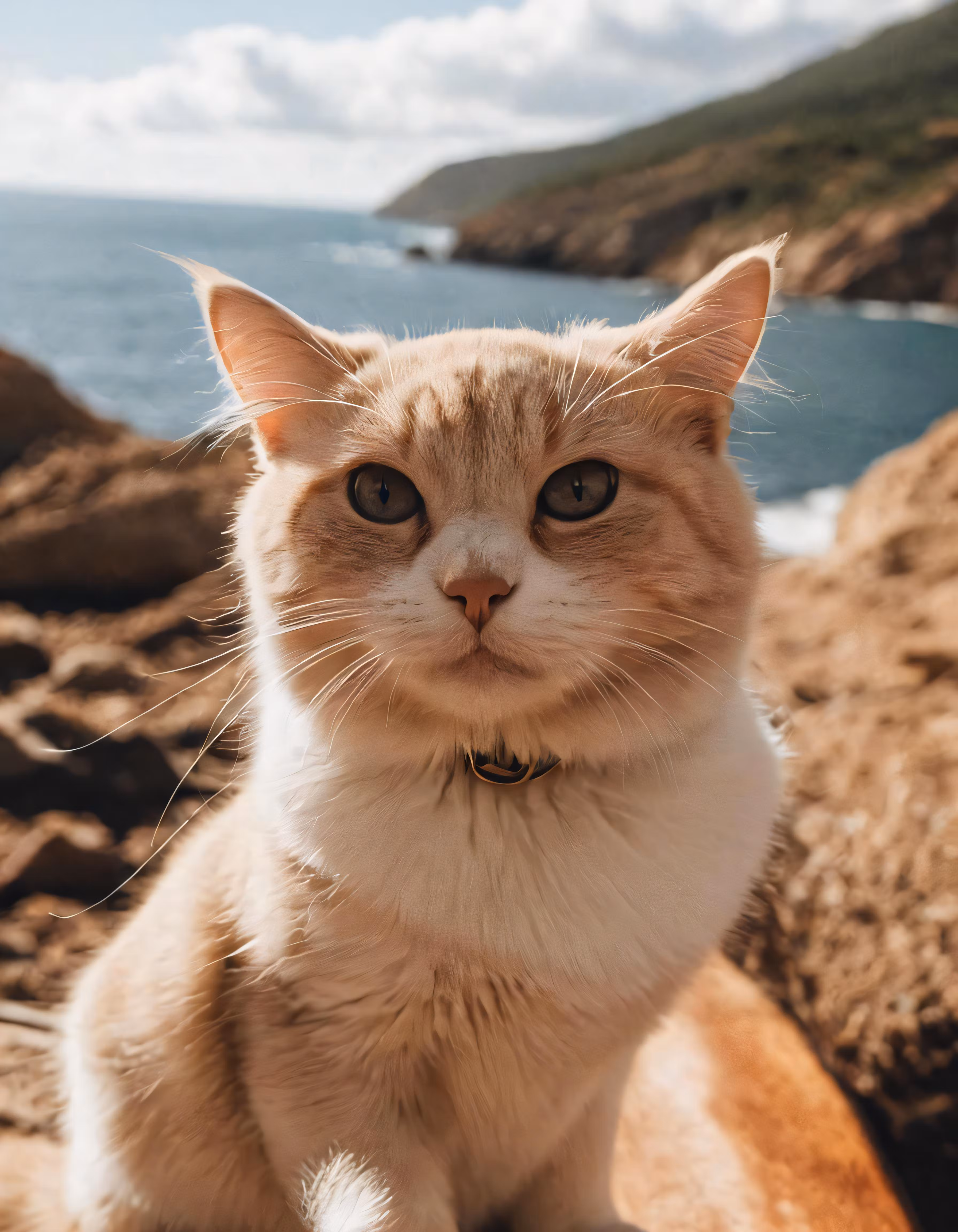 High resolution picture, free to use, a cat sitting on the side of a rock with blue water in the background