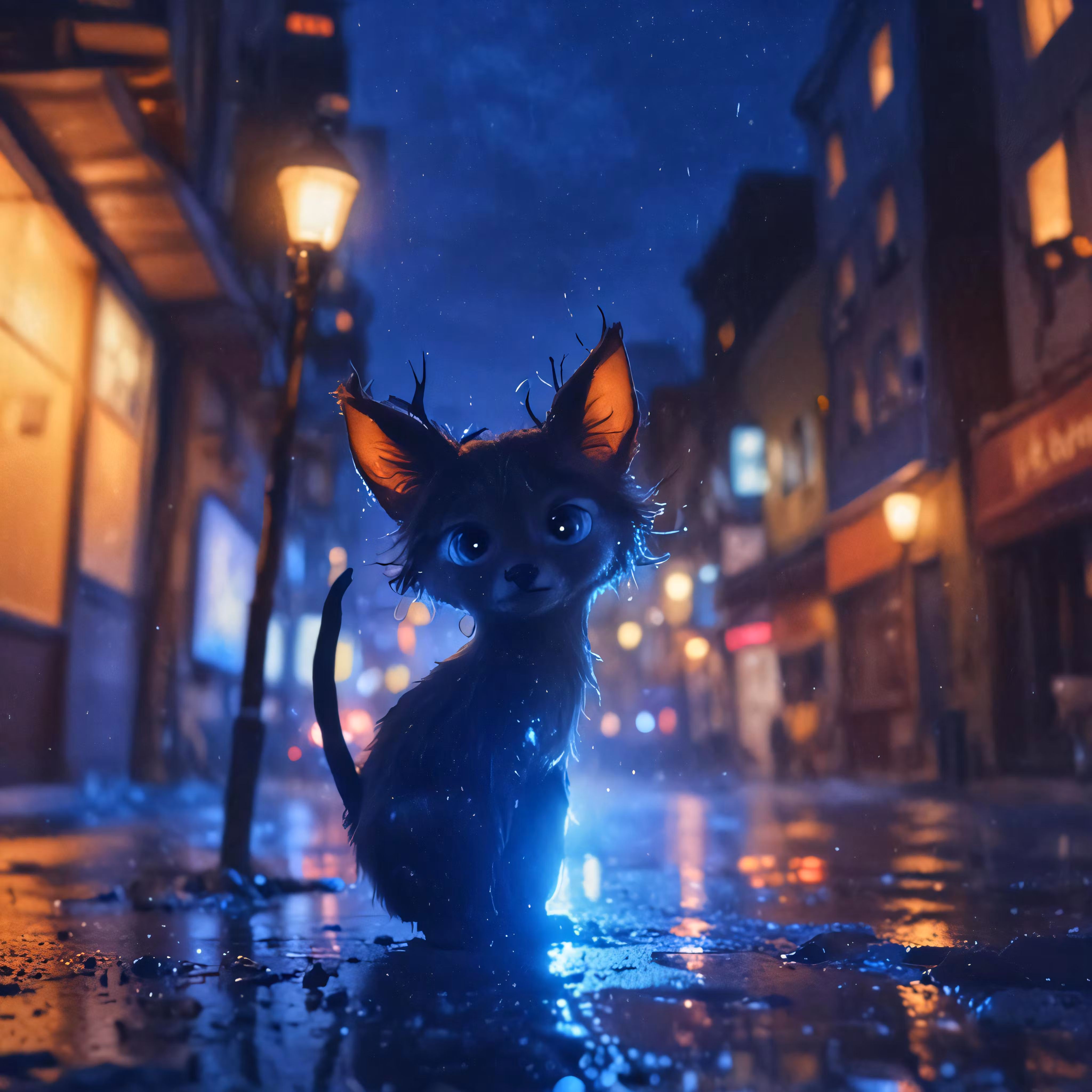 High resolution picture, free to use, a cat standing in the rain under a street light
