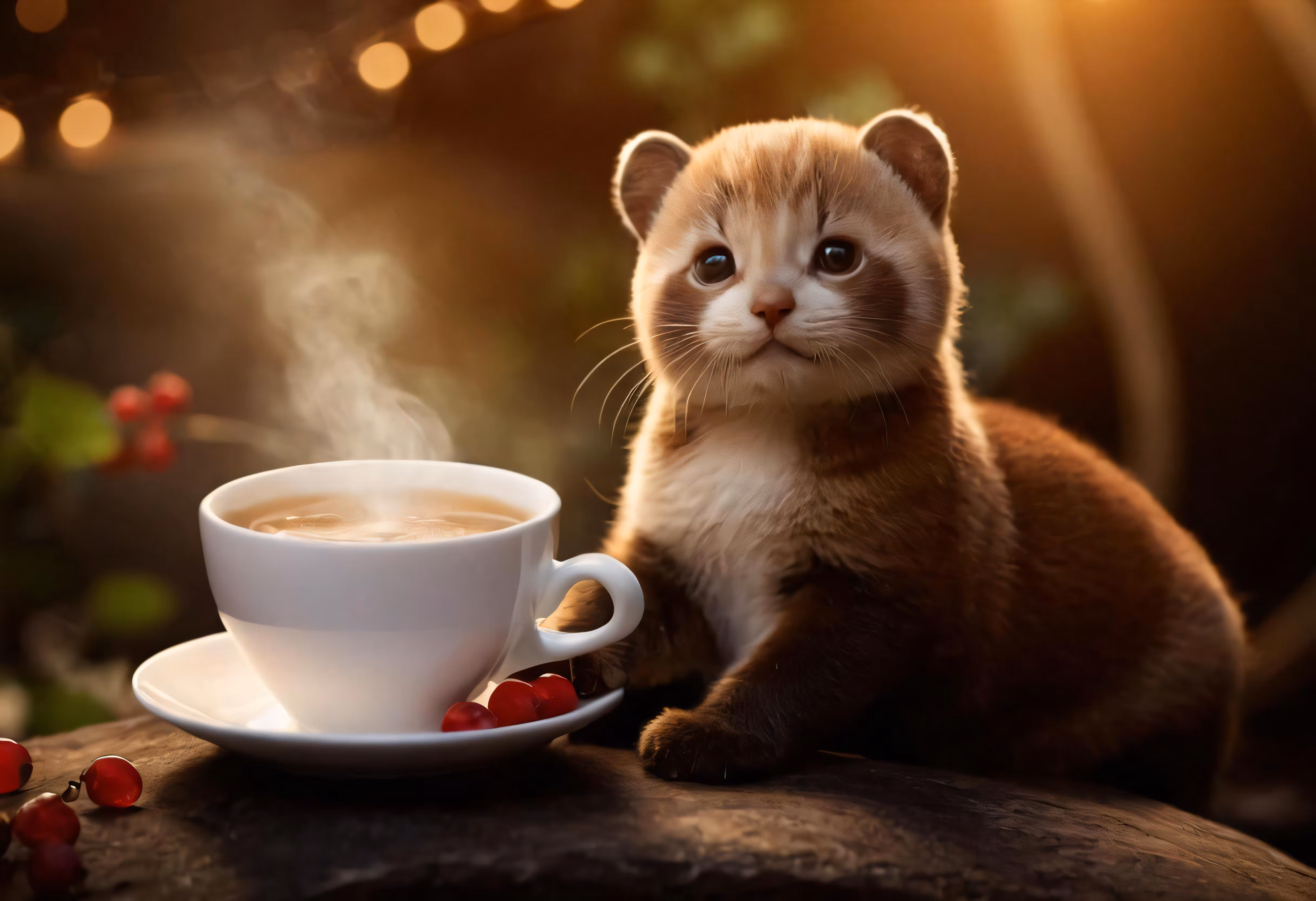High resolution picture, free to use, a cat that is sitting on a table with a cup