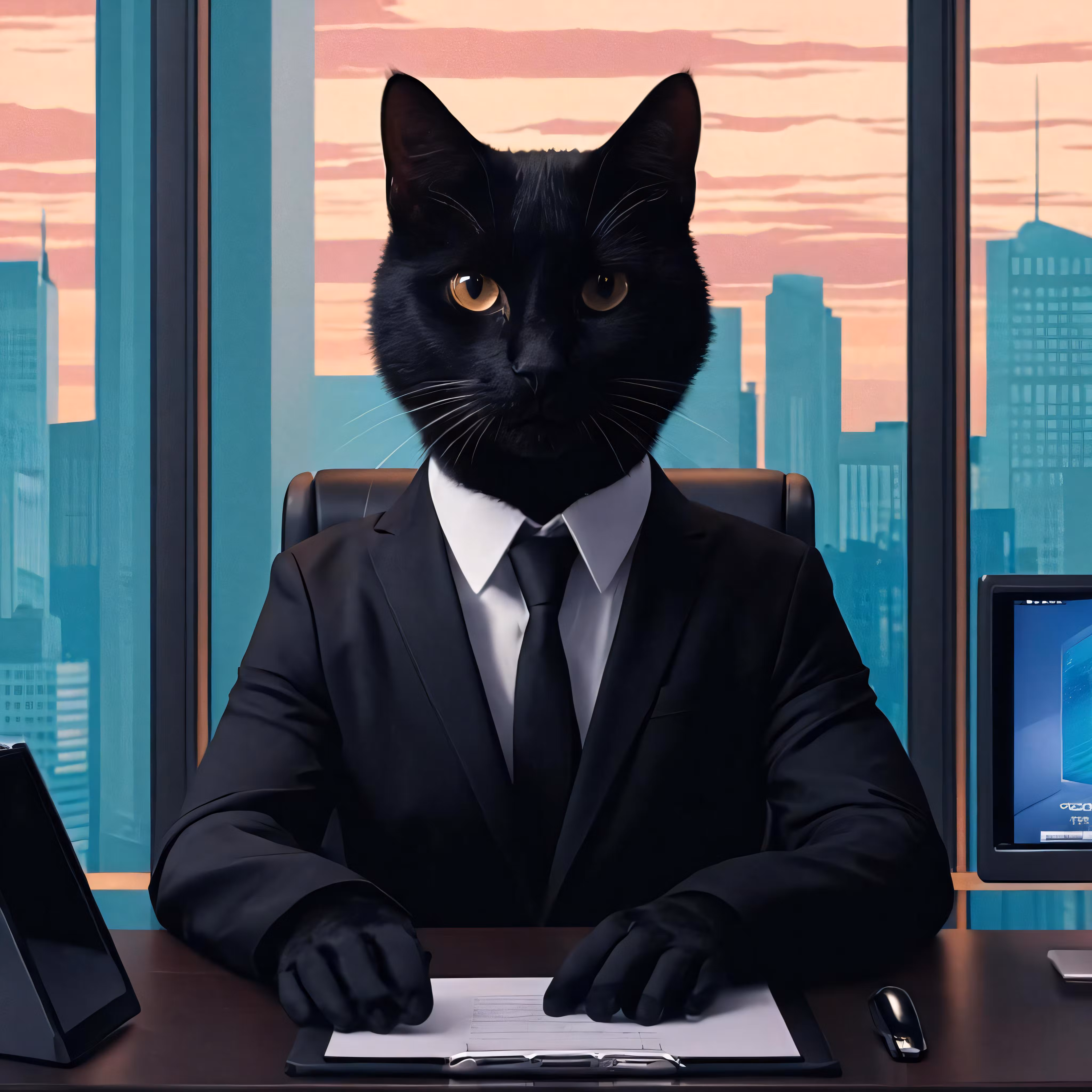 High resolution picture, free to use, a cat wearing a black suit and tie sits at a desk with a laptop