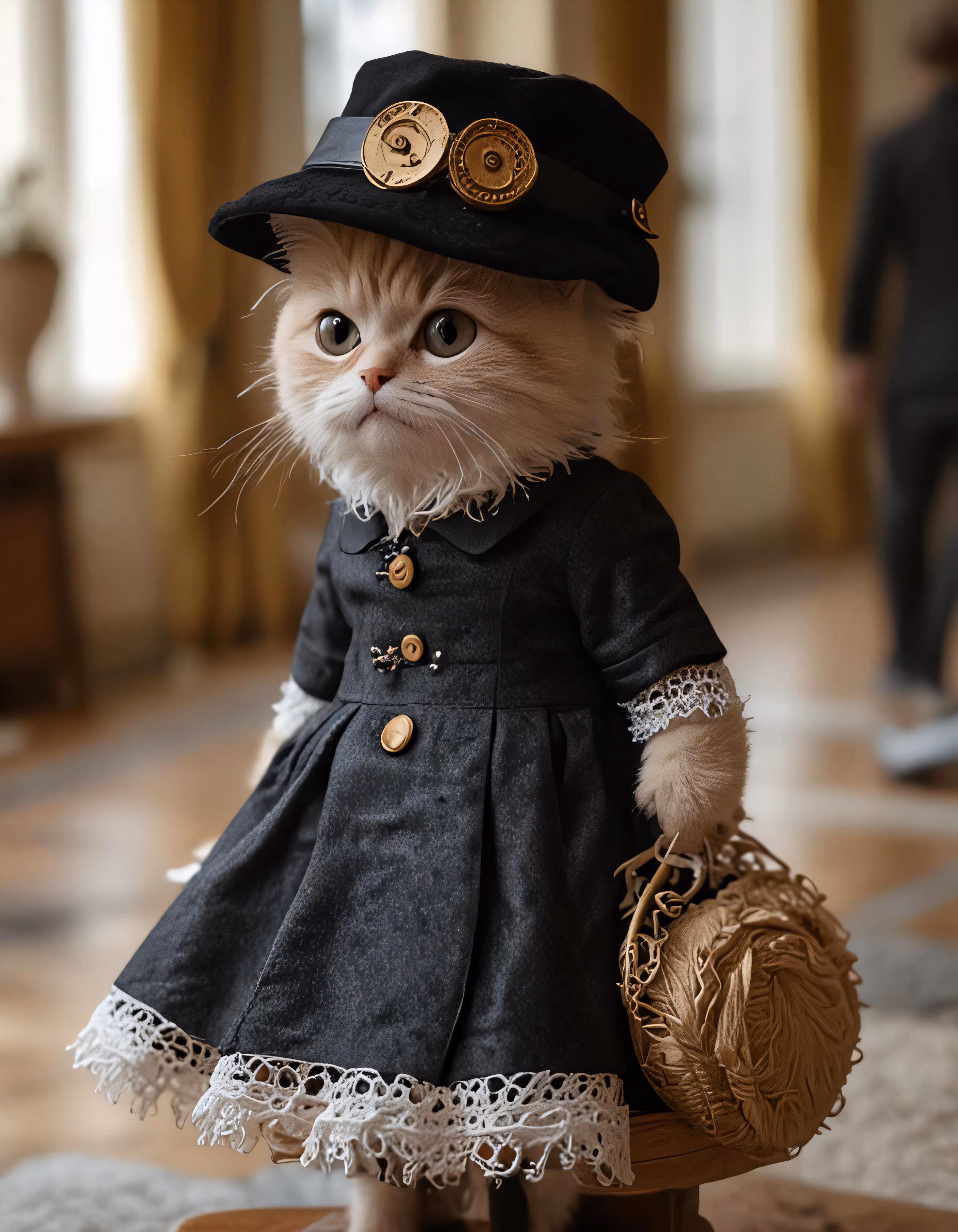 High resolution picture, free to use, a cat wearing a dress and bonnet with lace