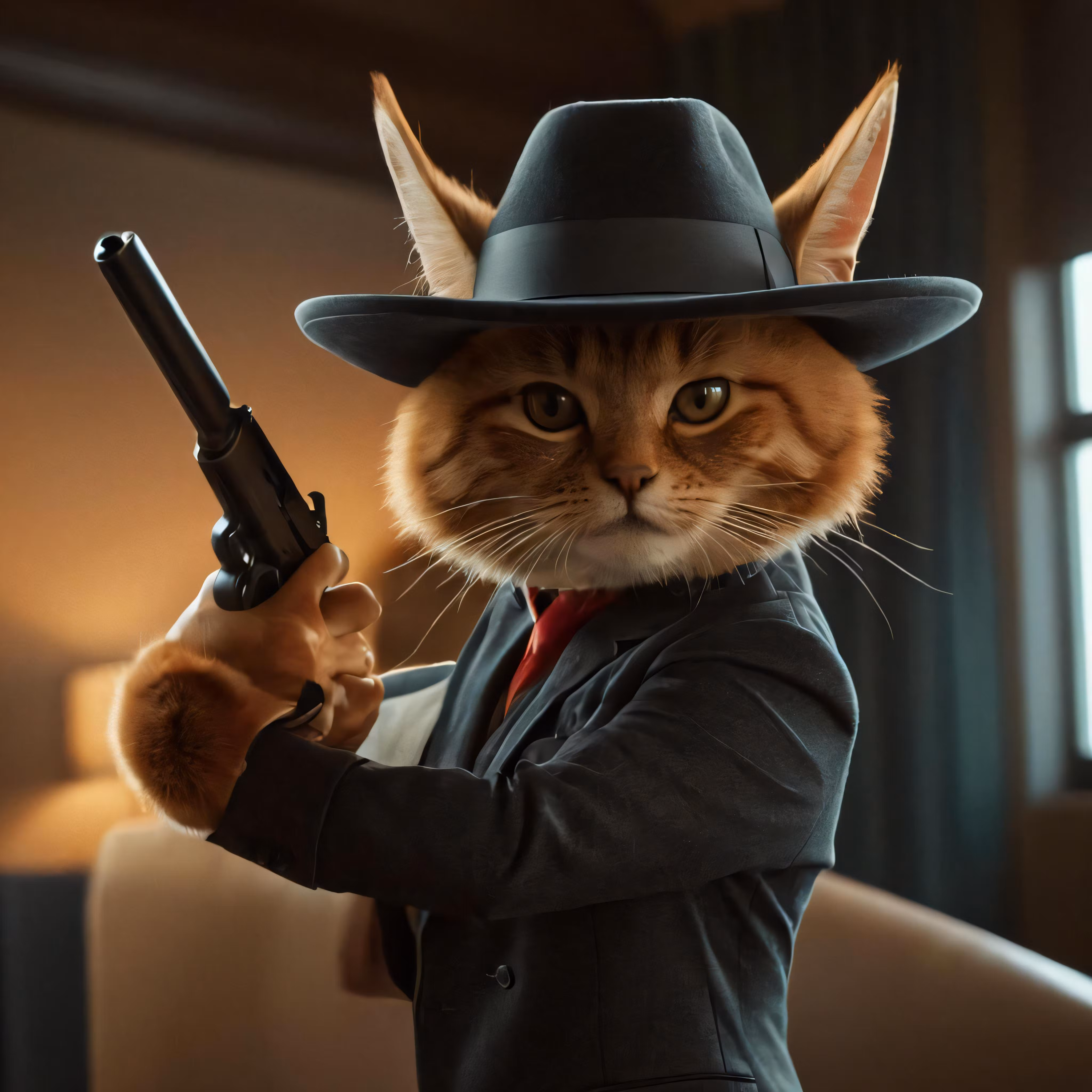 High resolution picture, free to use, a cat wearing a suit and hat holding a gun
