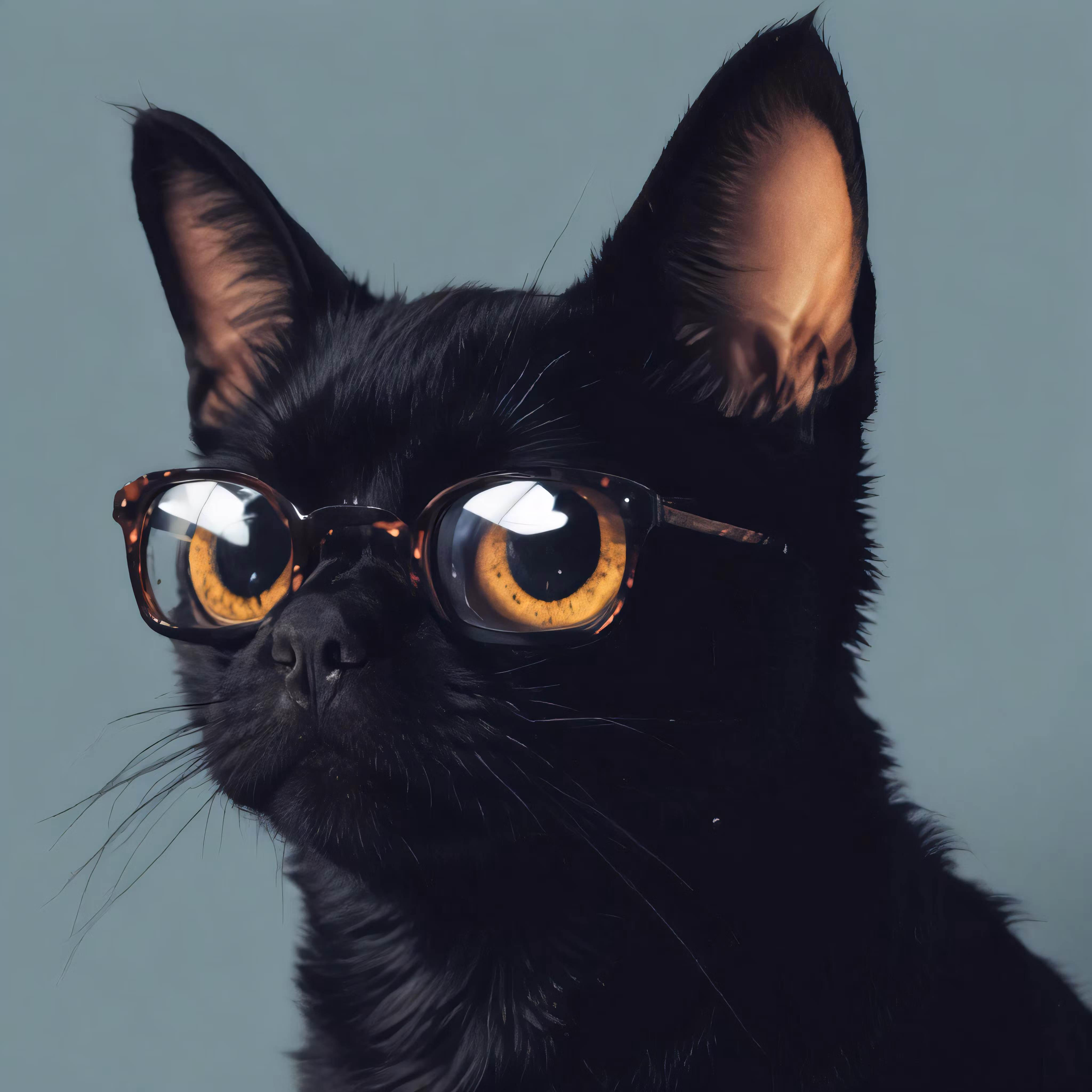 High resolution picture, free to use, a cat wearing glasses with yellow eyes on gray background