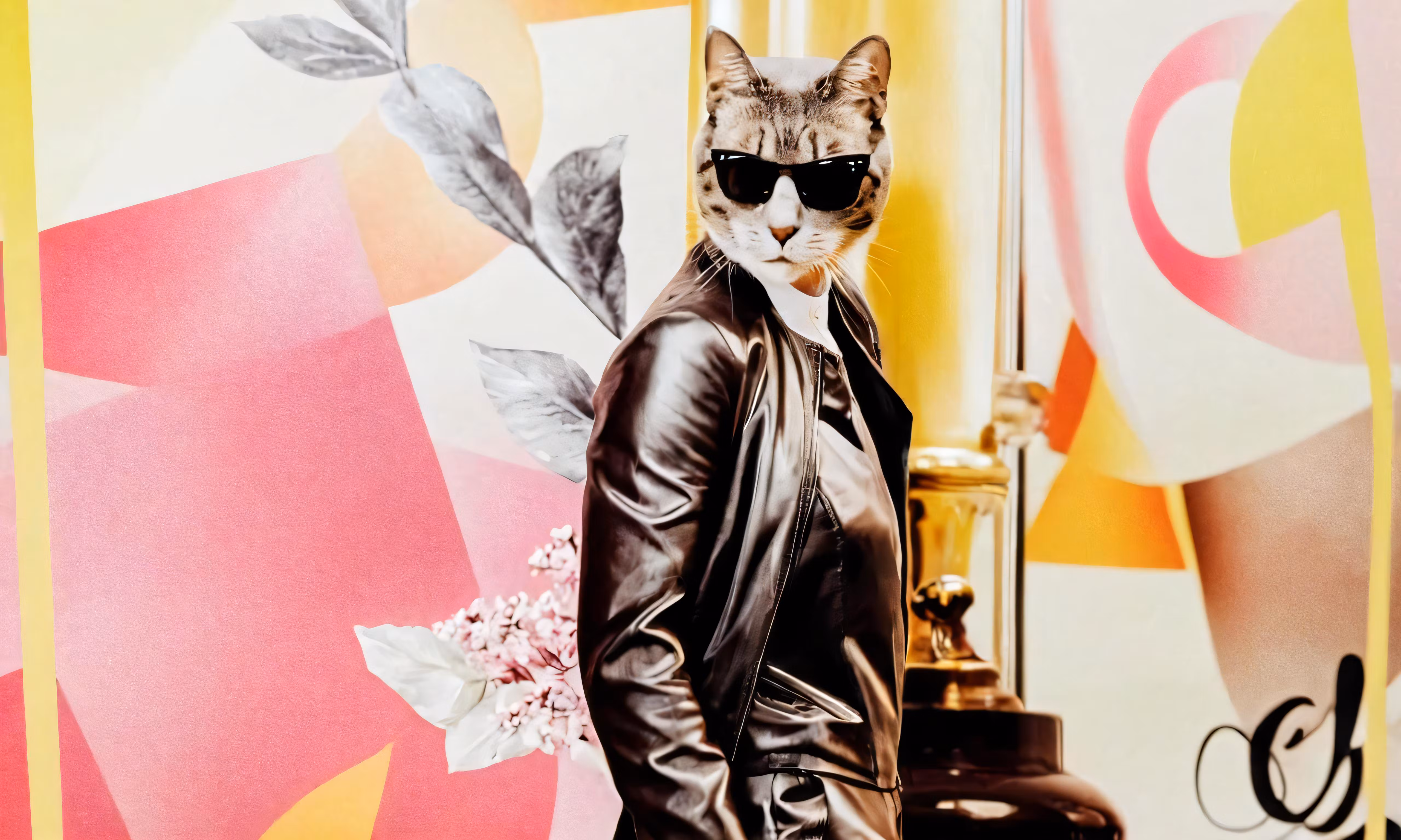 High resolution picture, free to use, a cat wearing sunglasses standing in front of an artistic mural