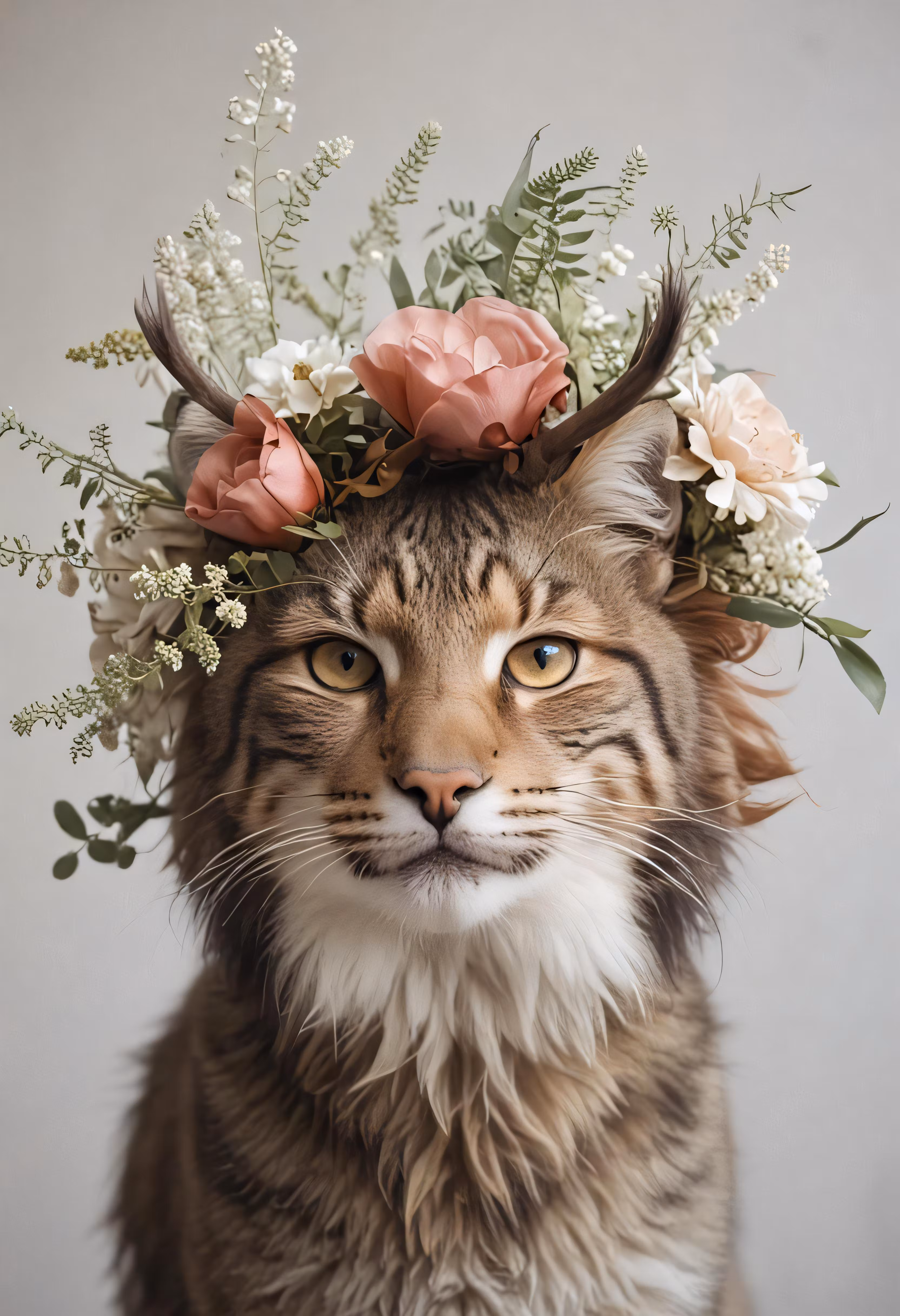 High resolution picture, free to use, a cat with flowers on its head wearing flower crown