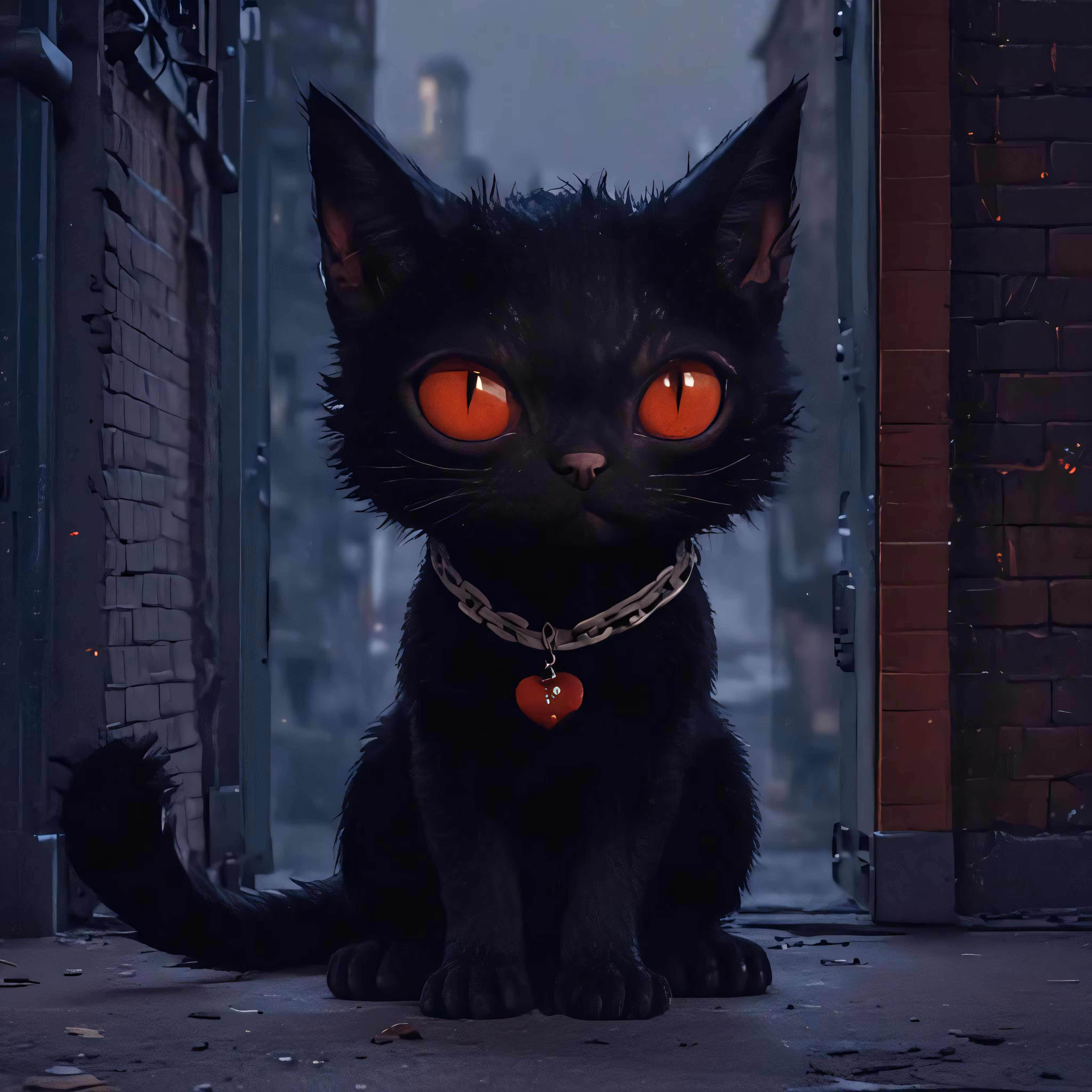 High resolution picture, free to use, a cat with glowing red eyes and a chain is sitting outside