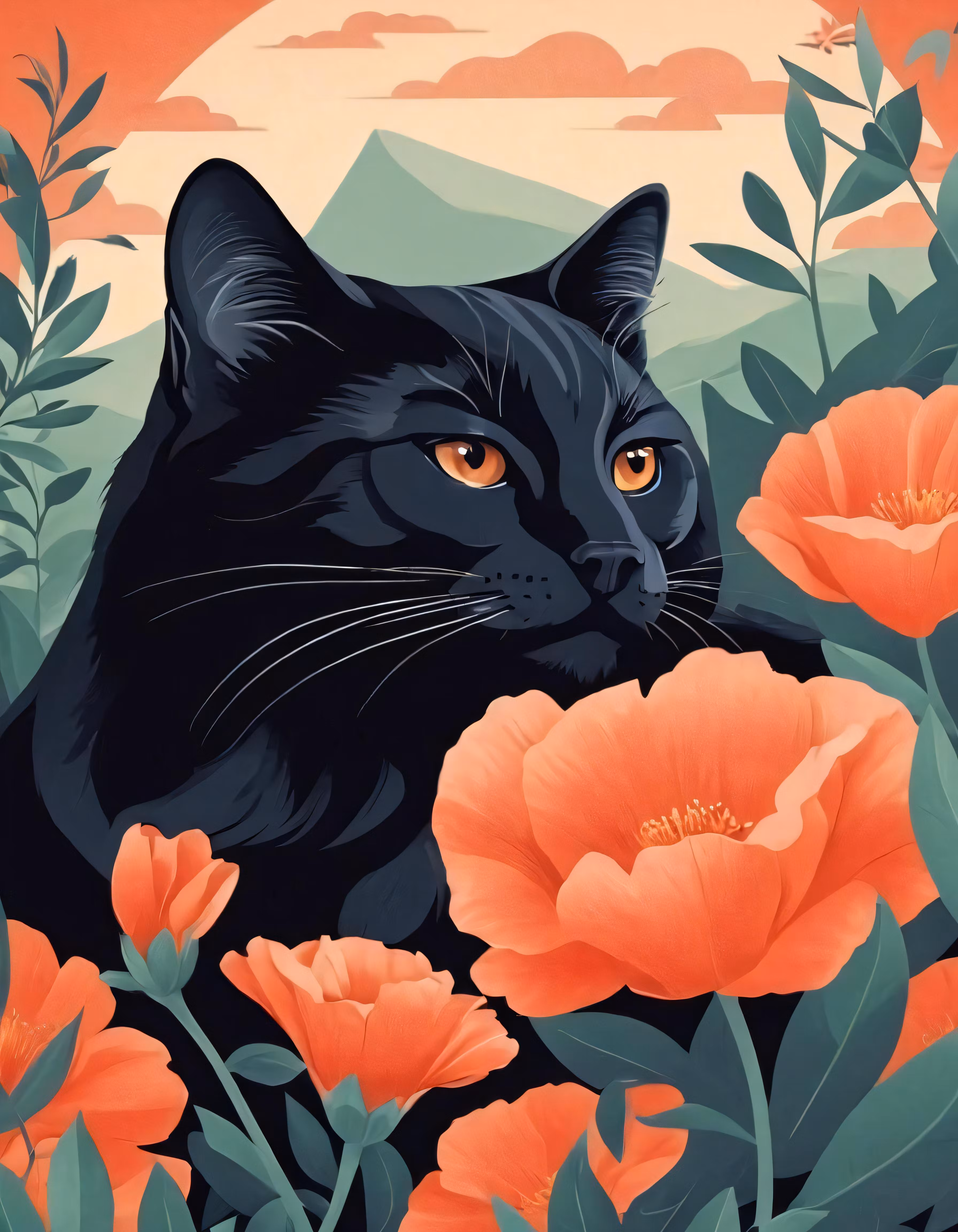 High resolution picture, free to use, a cat with orange eyes is sitting in a field of flowers