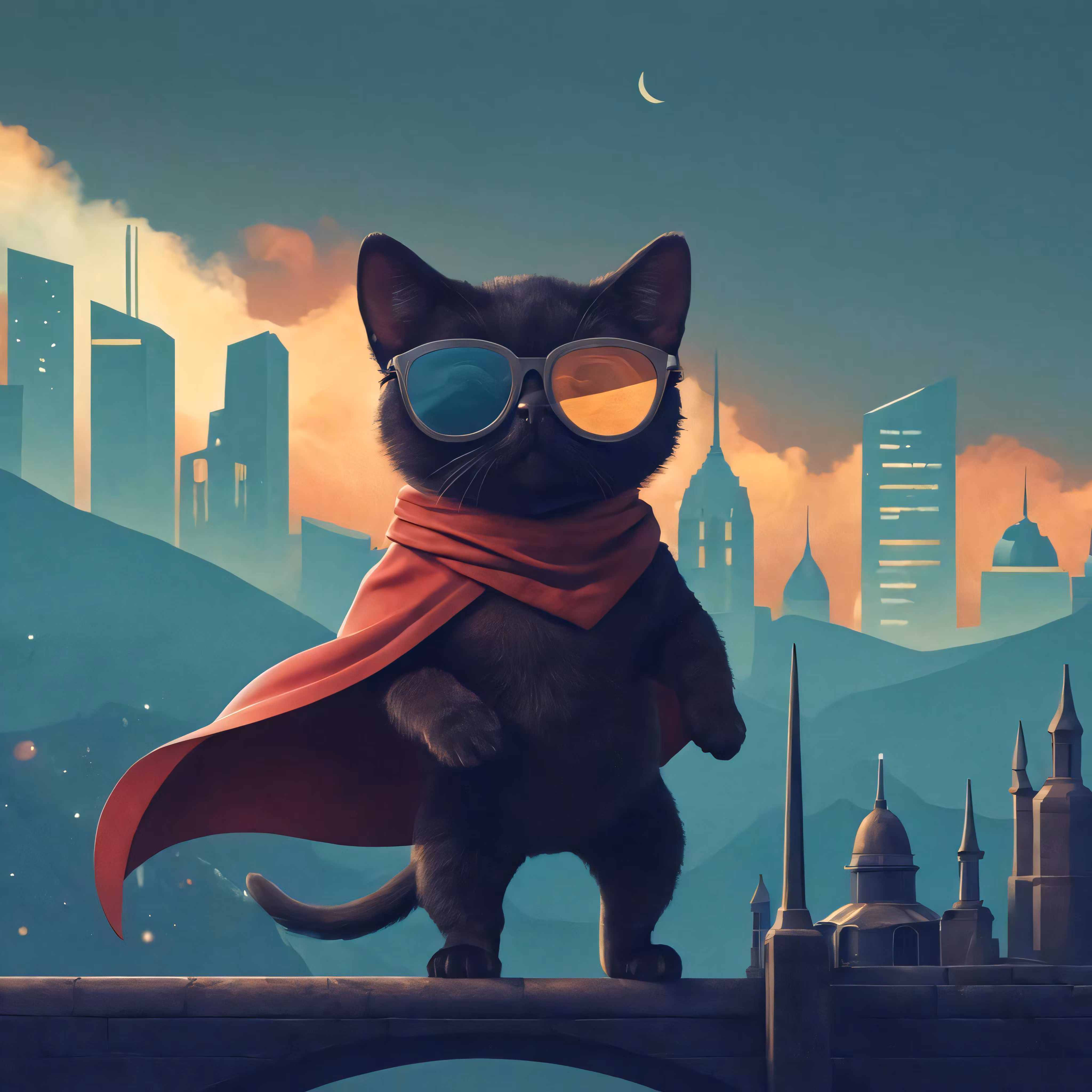 High resolution picture, free to use, a cat with sunglasses and a cape on, stands on a wall overlooking a city