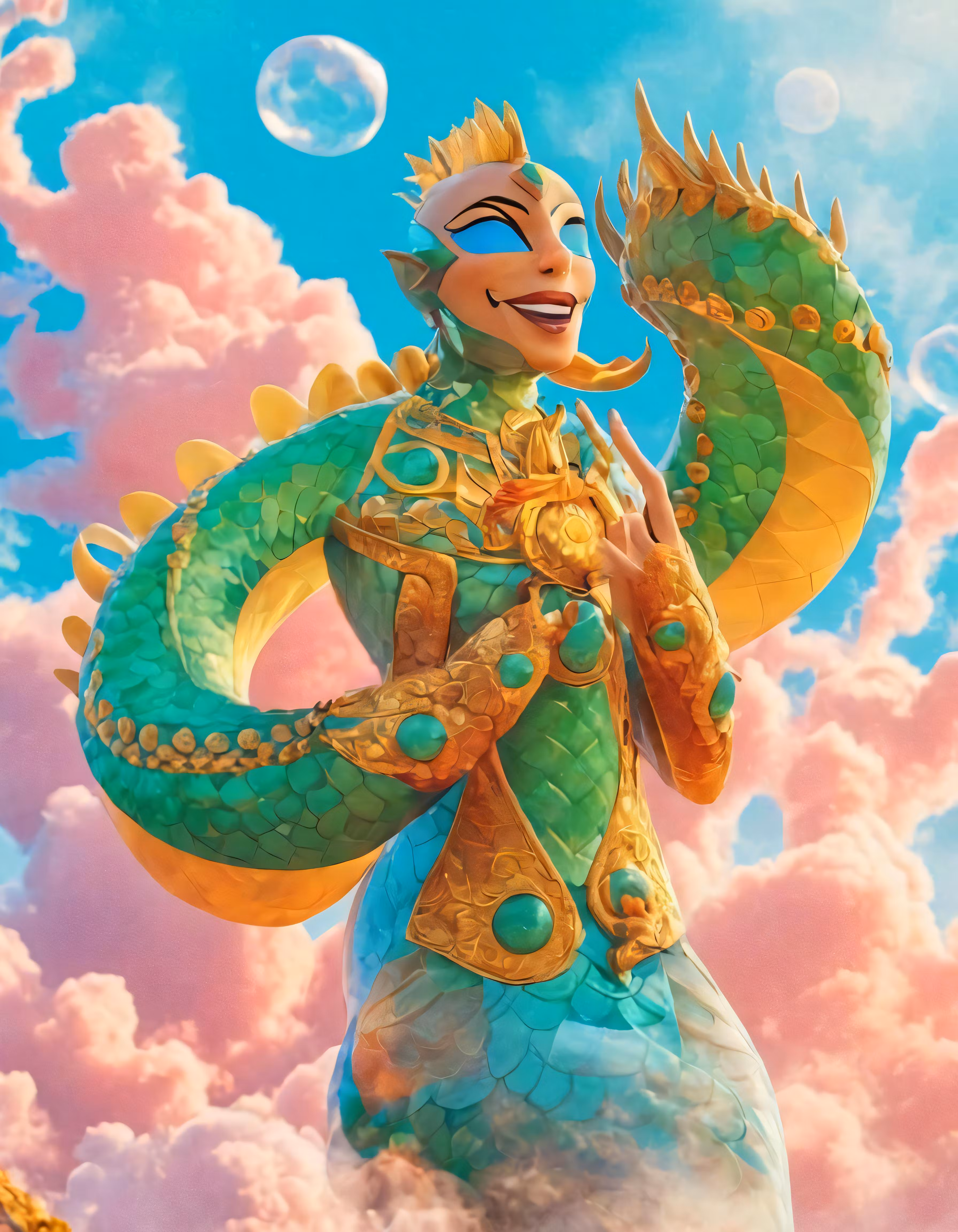 High resolution picture, free to use, a character with a head and arms is depicted in a sky full of bubbles