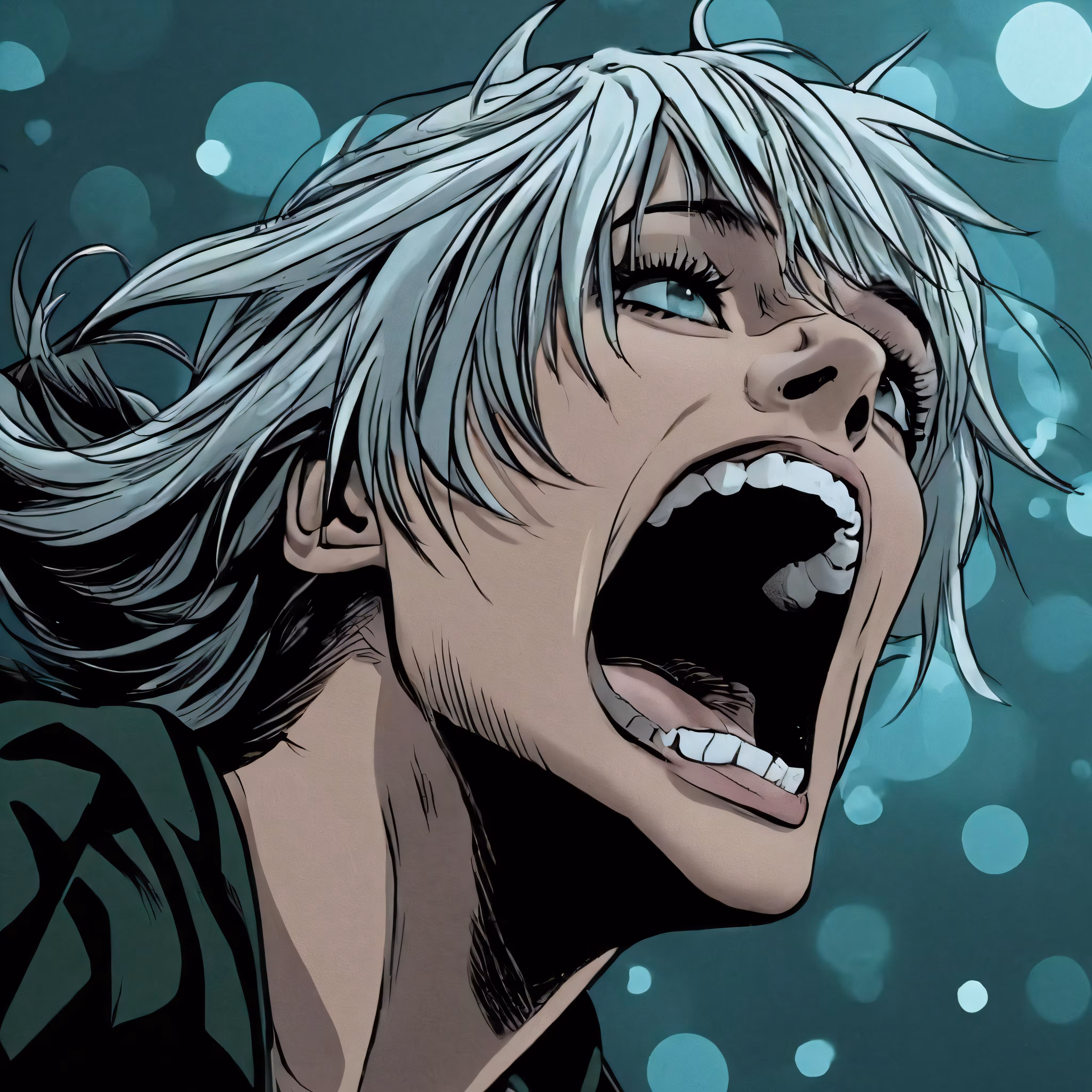 High resolution picture, free to use, a character with white hair is yelling with his mouth open