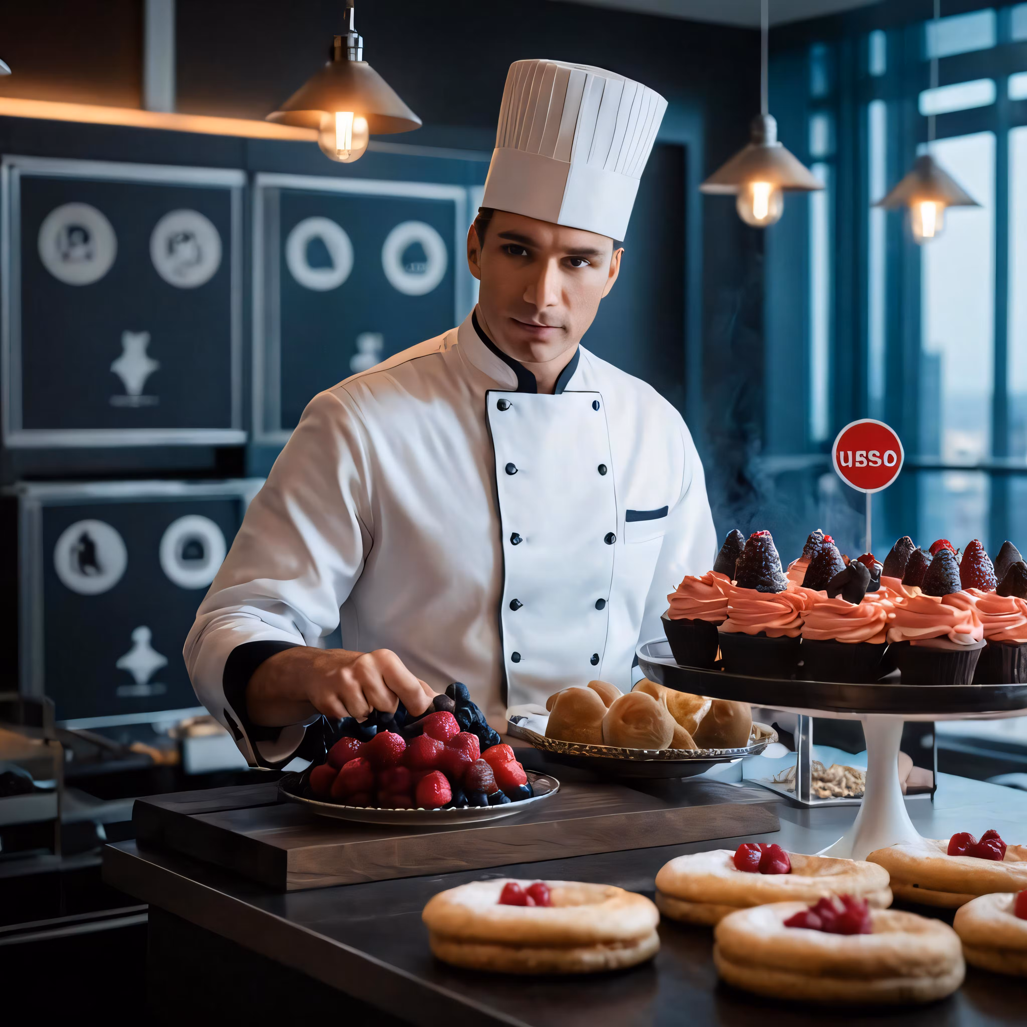 High resolution picture, free to use, a chef prepares food with desserts and pastries in a large room