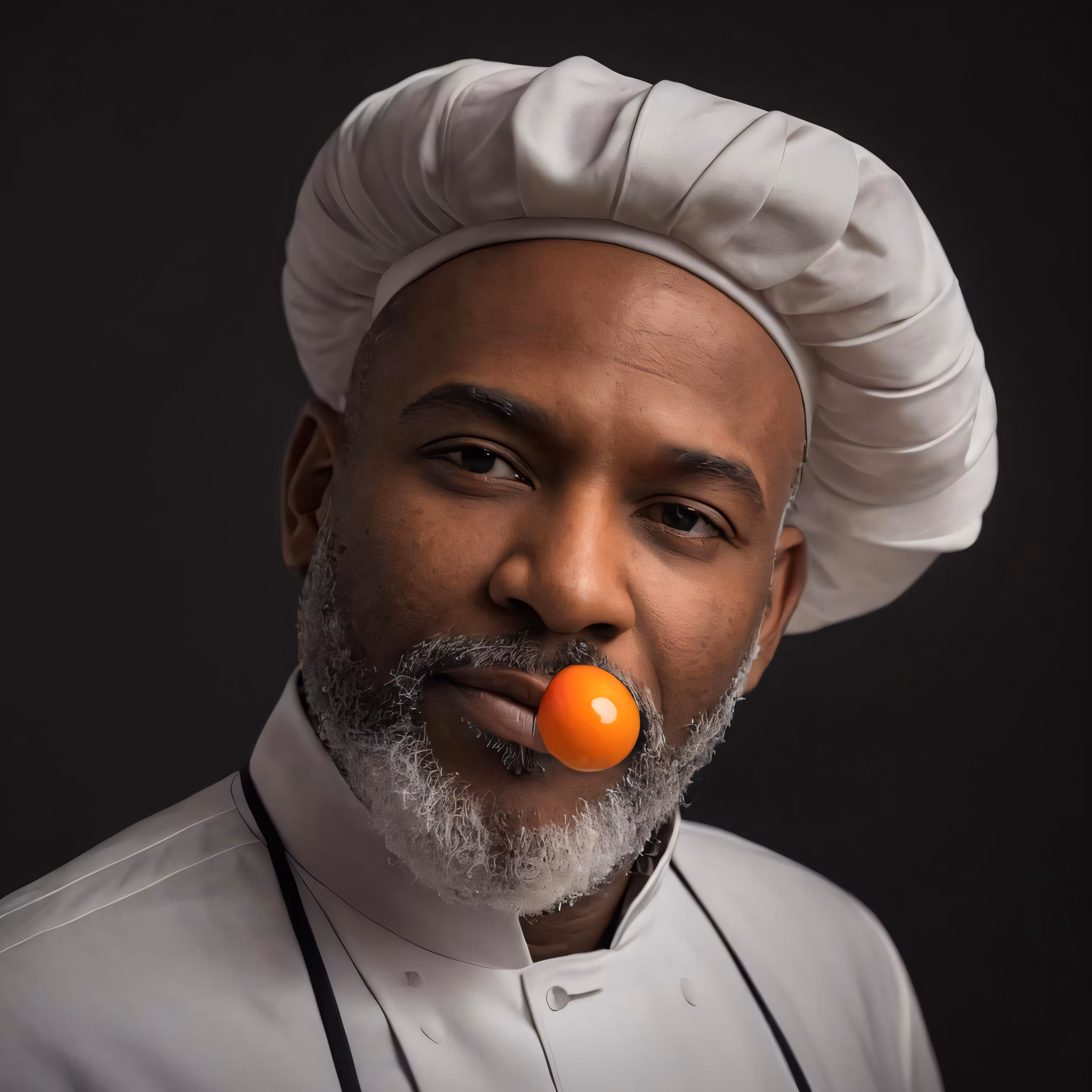 High resolution picture, free to use, a chef wearing a white hat and orange nose bubble