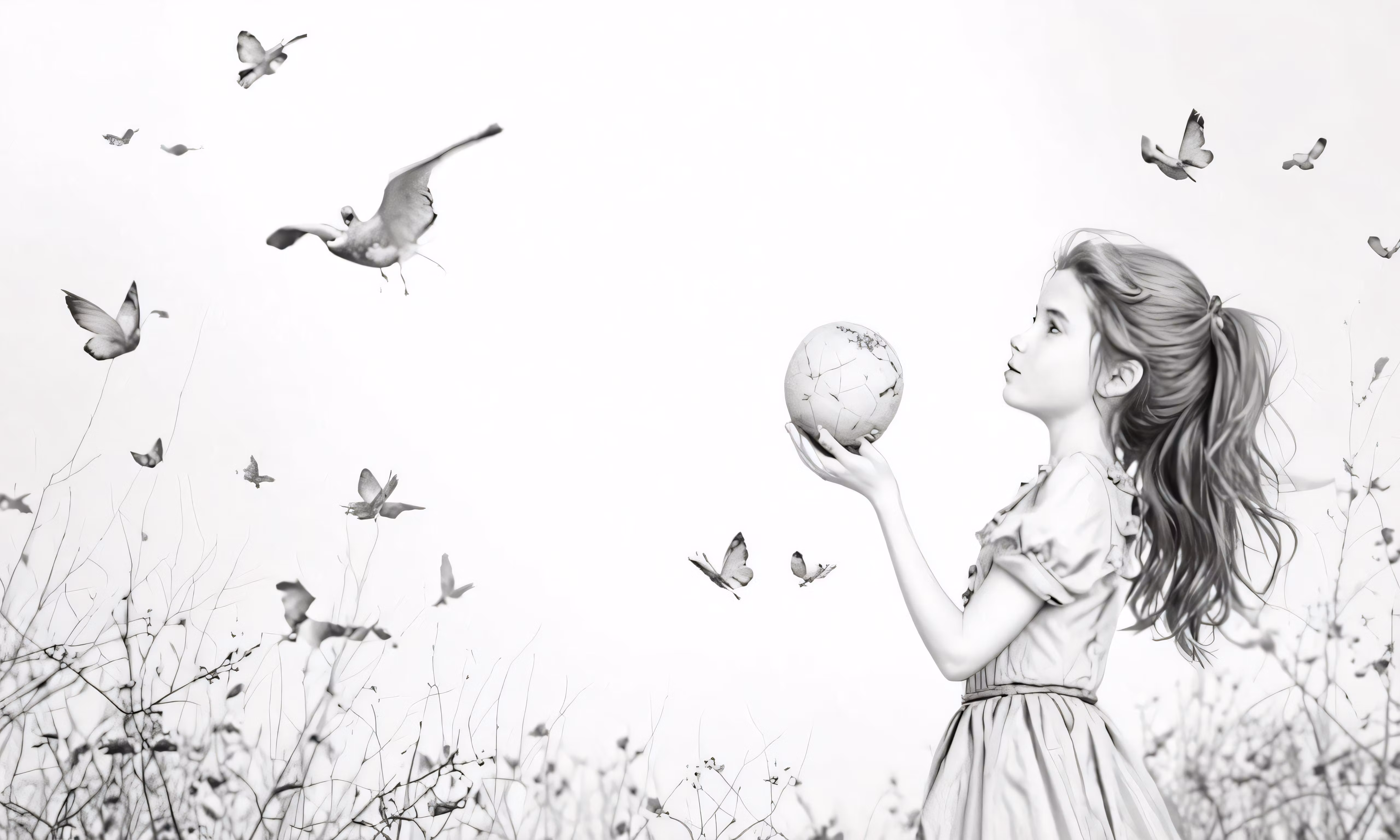 High resolution picture, free to use, a child holding a ball standing next to a field of grass