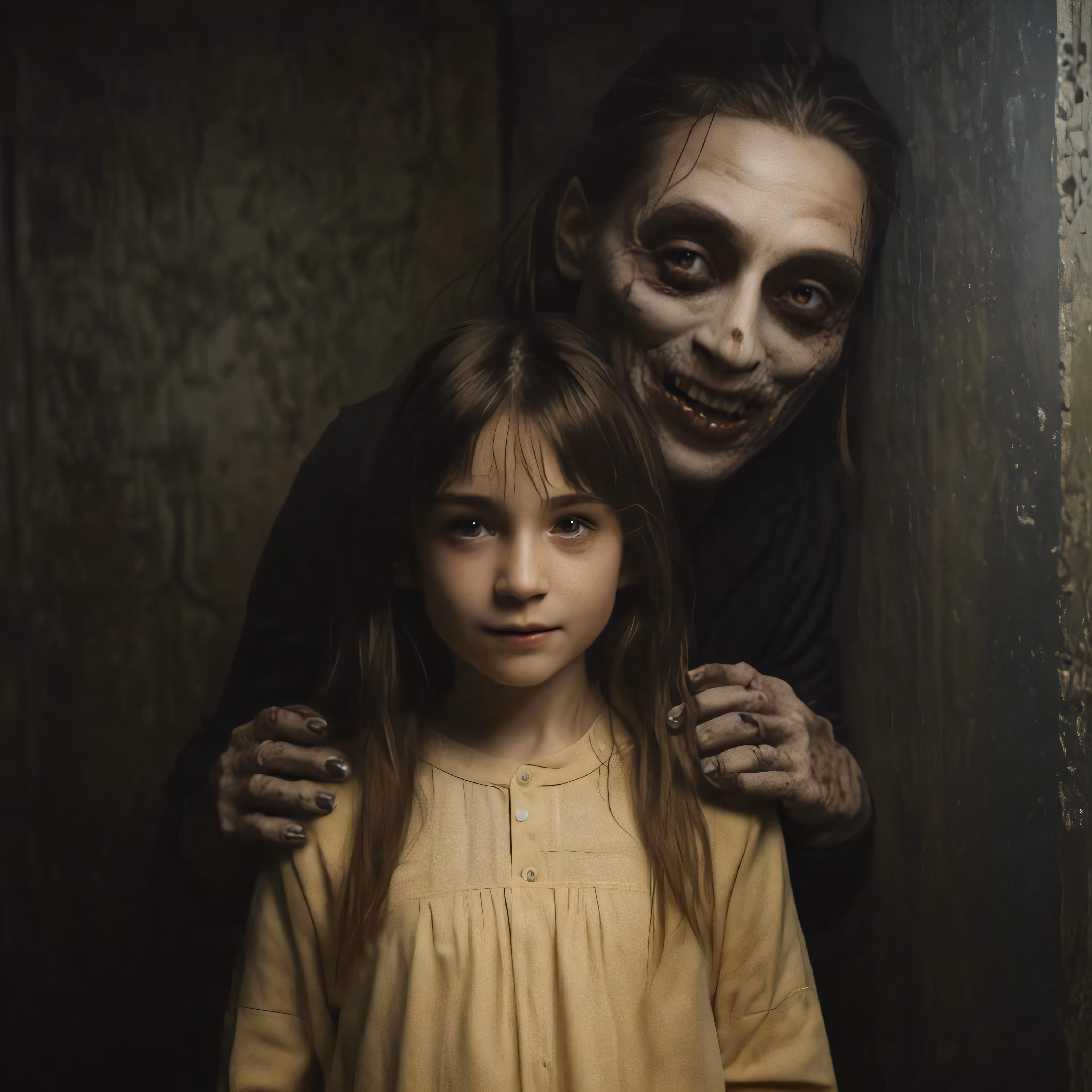 High resolution picture, free to use, a child in a zombie costume is standing next to an adult