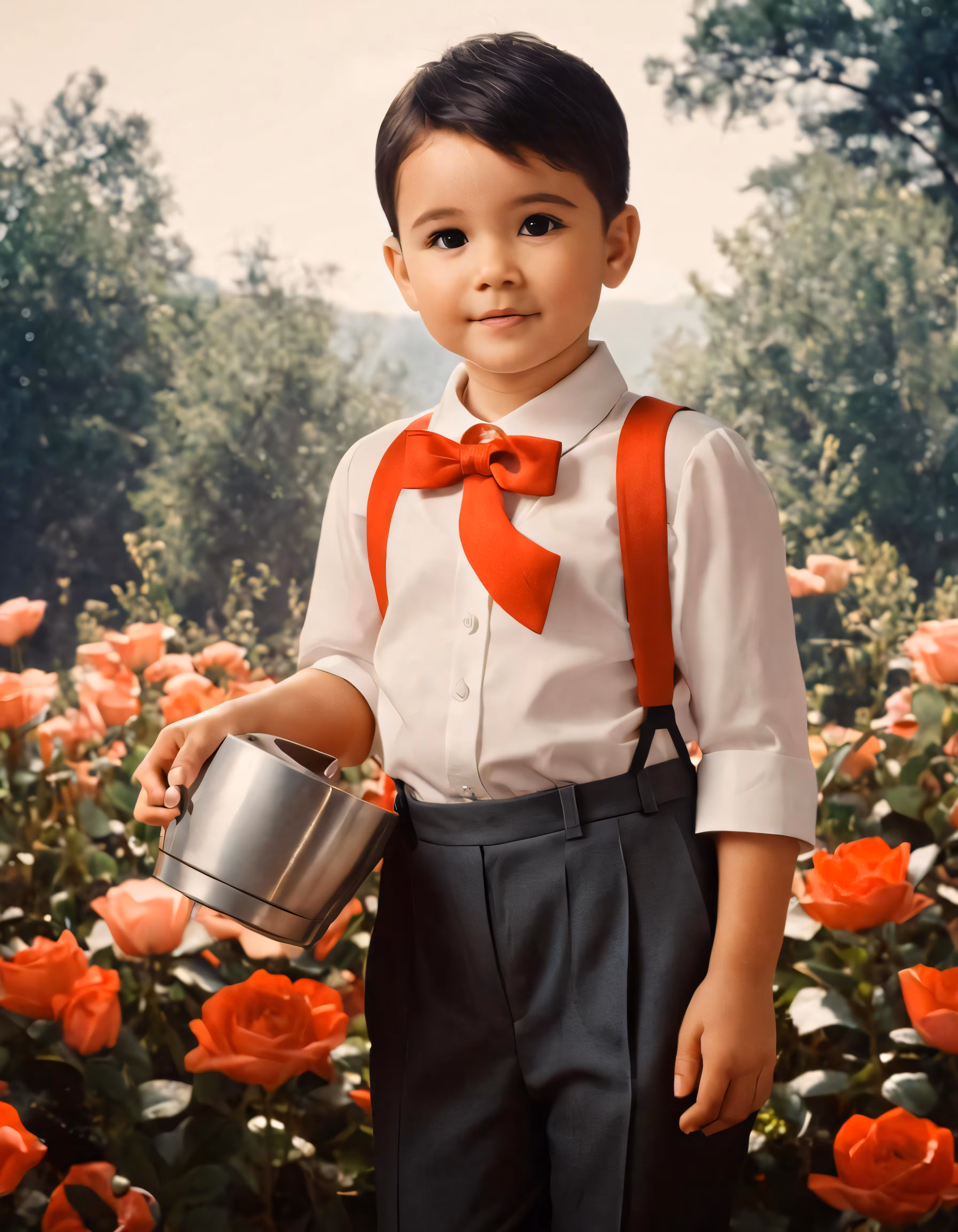 High resolution picture, free to use, a child is wearing a white shirt and black pants with red bow tie