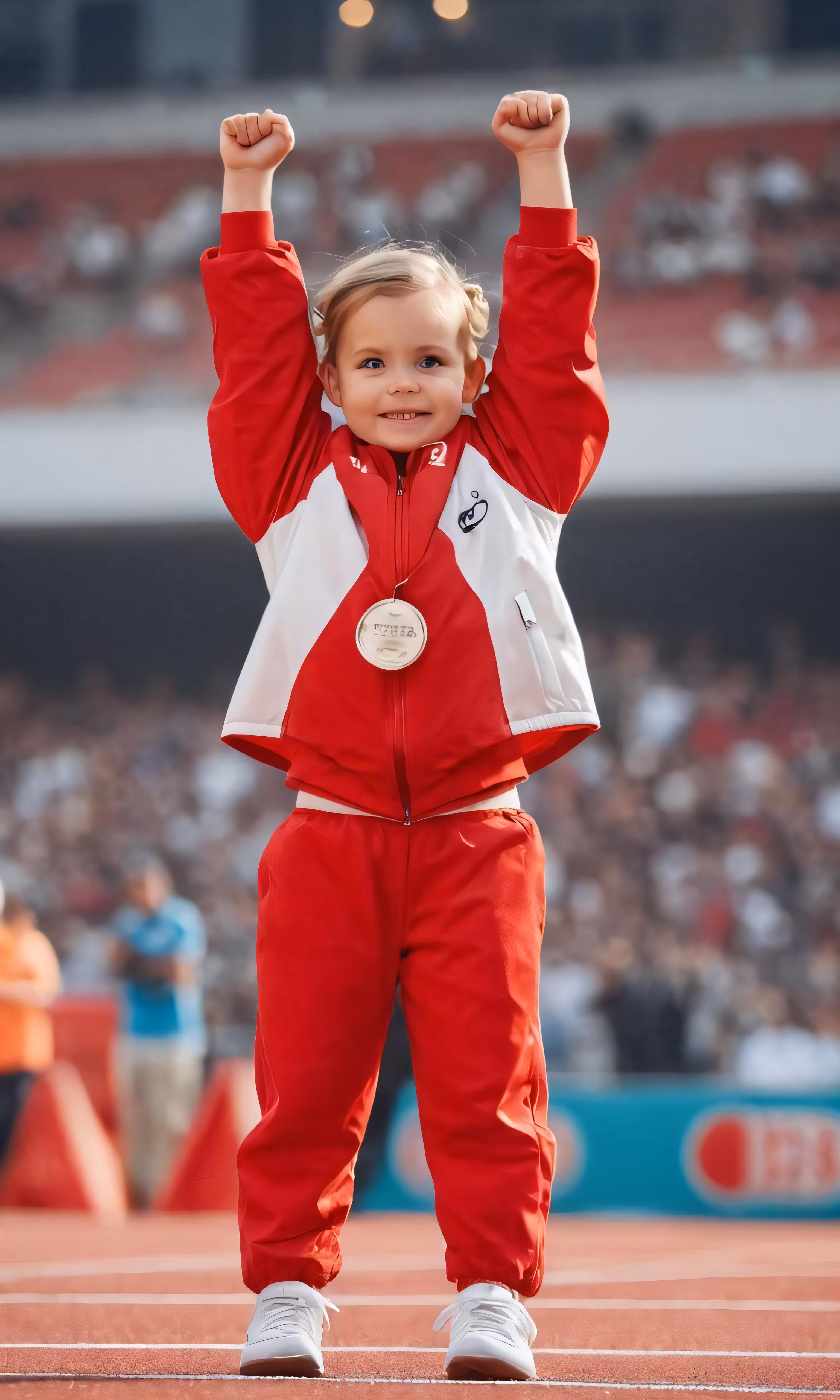 High resolution picture, free to use, a child on a track with her hands up in the air