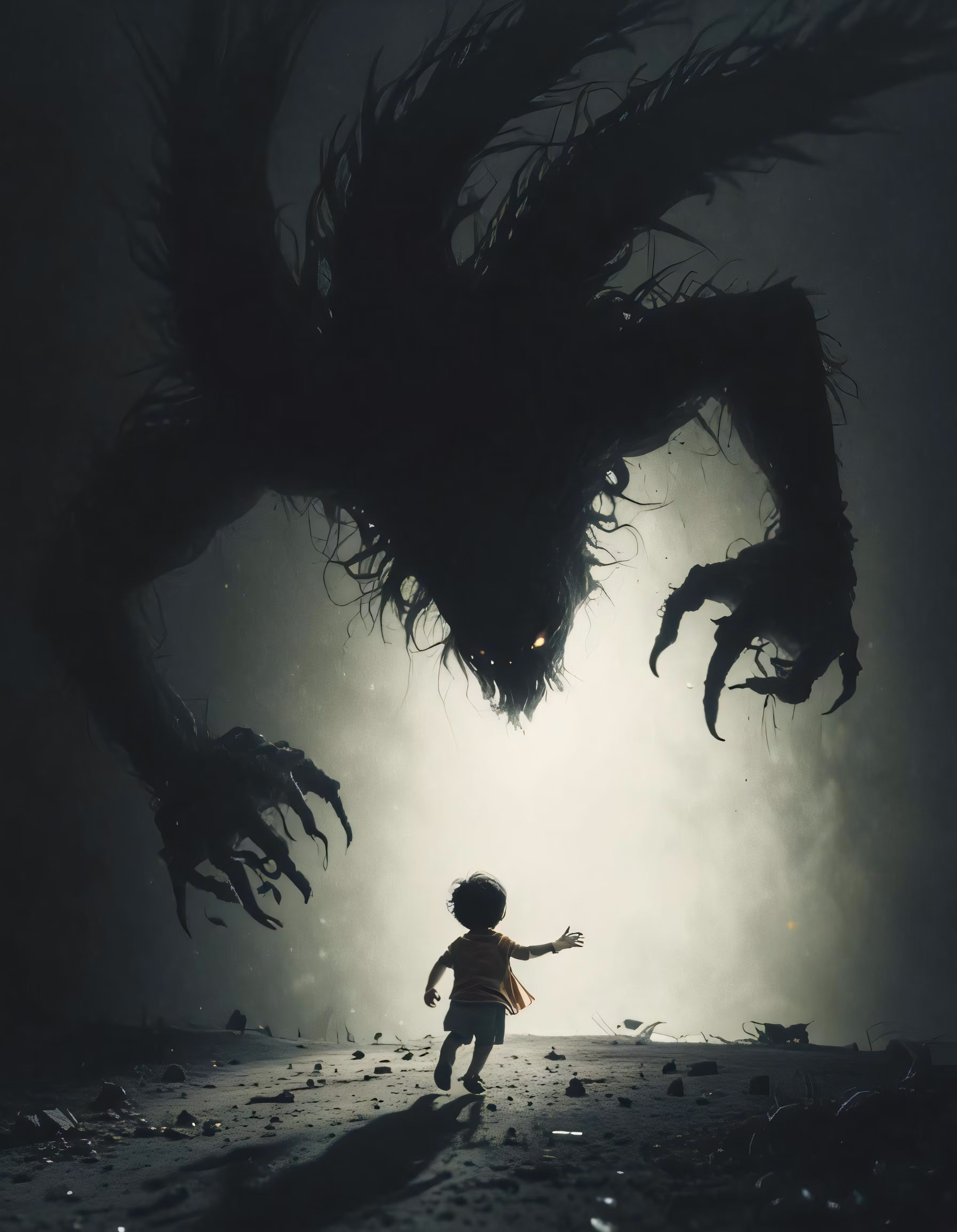 High resolution picture, free to use, a child stands beneath a giant, scary monster