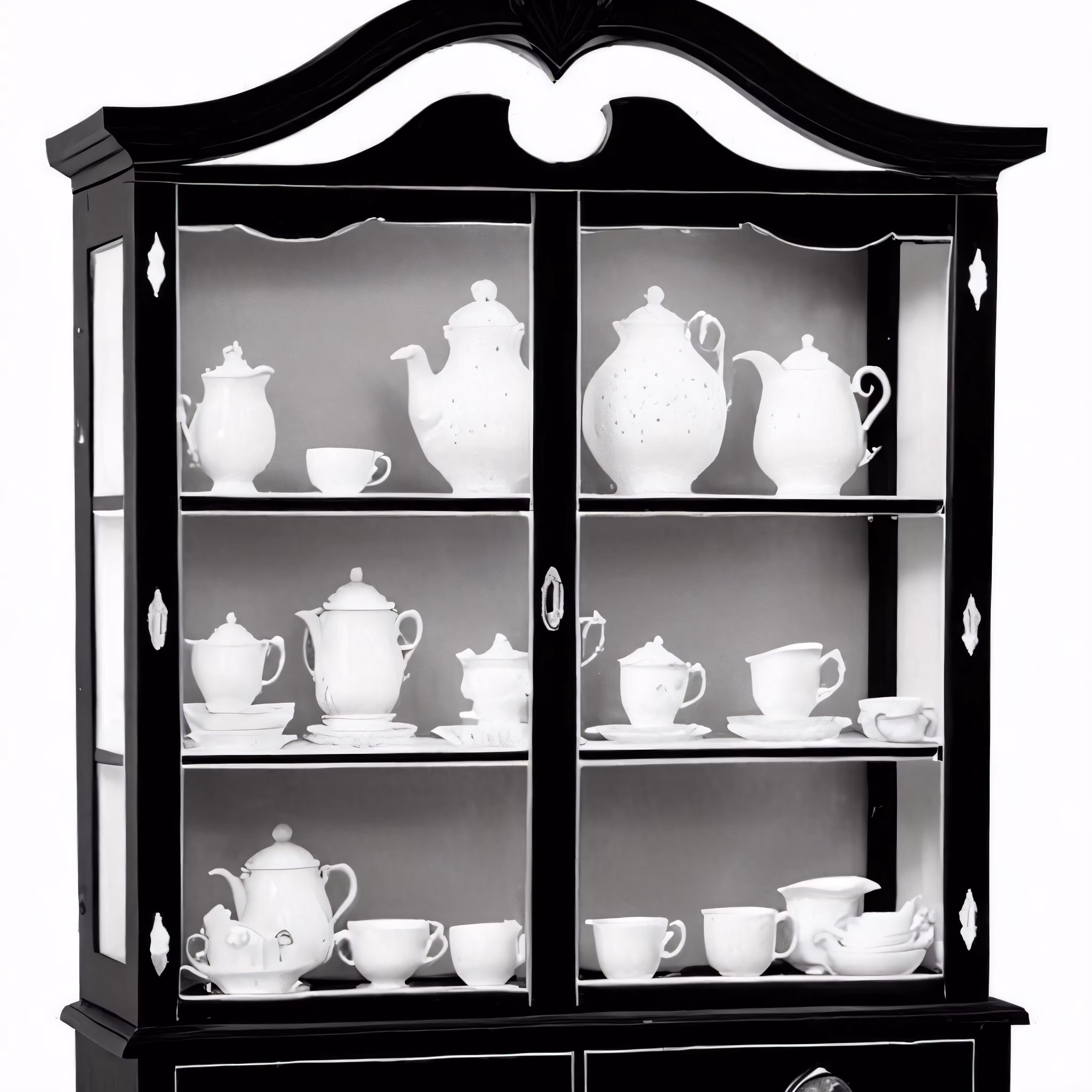 High resolution picture, free to use, a china cabinet with many white porcelain teapots